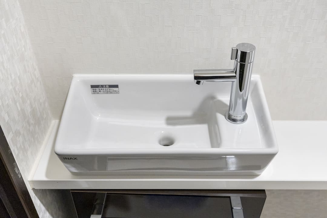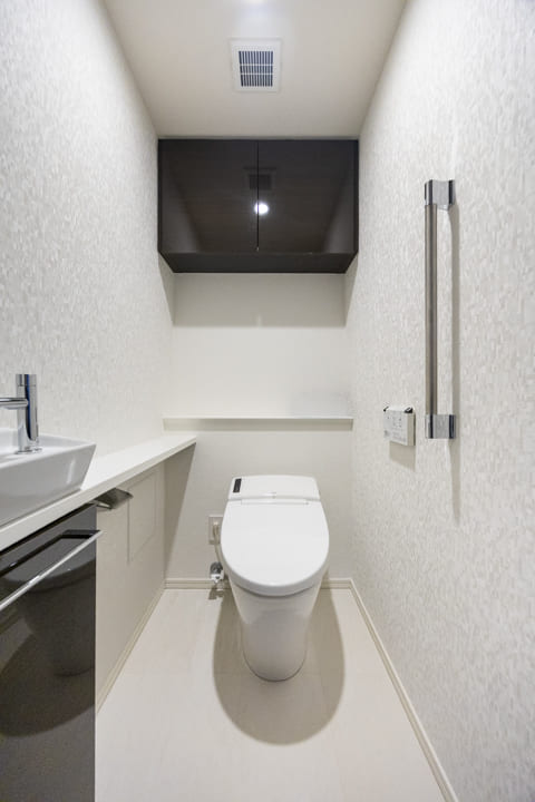 ウォシュレット一体型のトイレです。タンクレスタイプなのですっきりとした印象に。また、別途で手洗い器が造られているので、すぐに手を洗うことができて衛生的です。上部には吊戸棚が設置されていて、収納スペースもありますよ。カウンタースペースにはアロマなどを置いても◎。