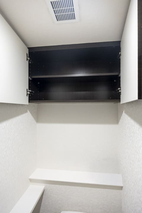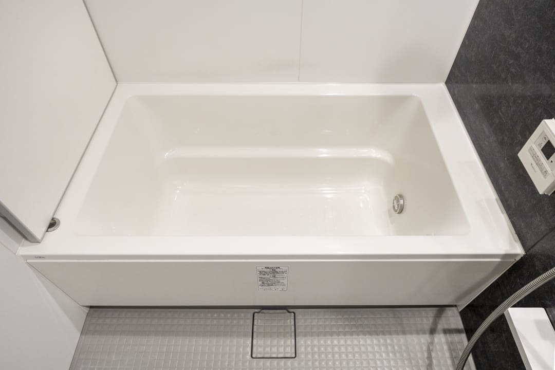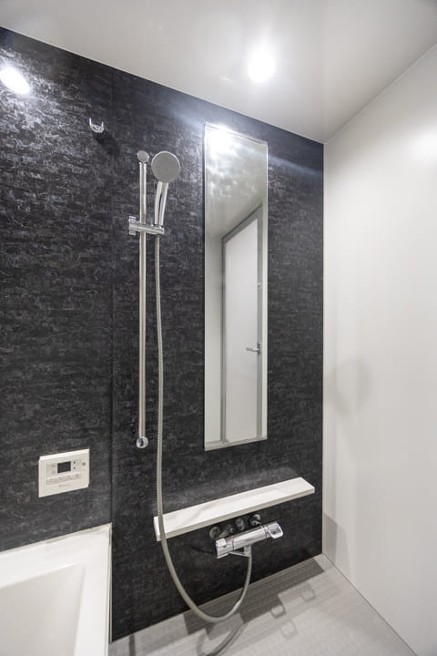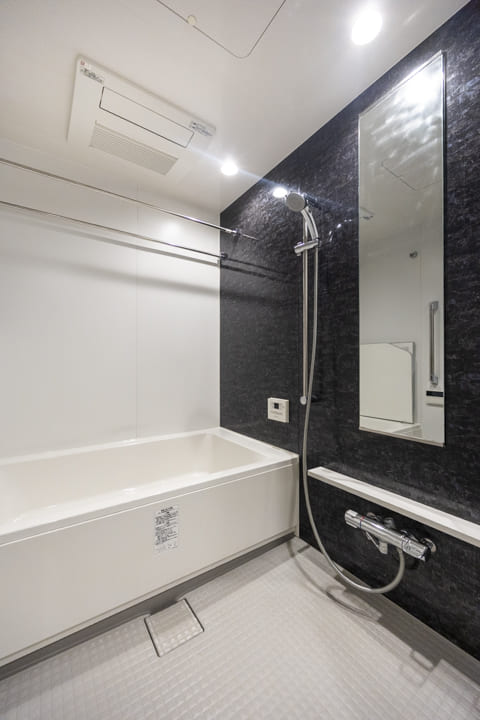 1418サイズのバスルームは、ダークカラーの壁パネルがアクセントになっています。お風呂にゆっくり浸かるのが好きという方に嬉しい追い焚き機能を搭載。家族の入浴時間がずれてしまっても安心です。また、浴室乾燥機には暖房・乾燥・換気・ミストサウナの機能がついており、一年中快適に過ごすことができます。