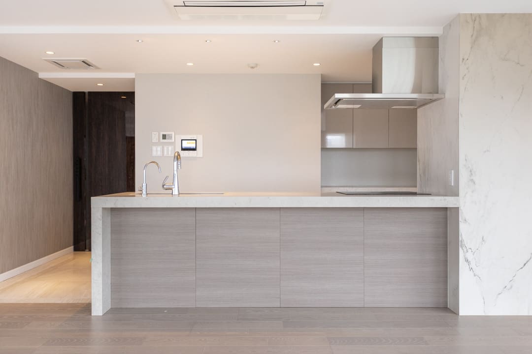 質感の異なる石柄のアクセントウォールが空間に奥行きを与え、上質な雰囲気を演出します。天井にすっきりと収まるビルトインエアコンを採用し、意匠性を損なうことなく快適性を確保。素材の美しさと機能性が調和した、洗練された住空間に仕上がっています。