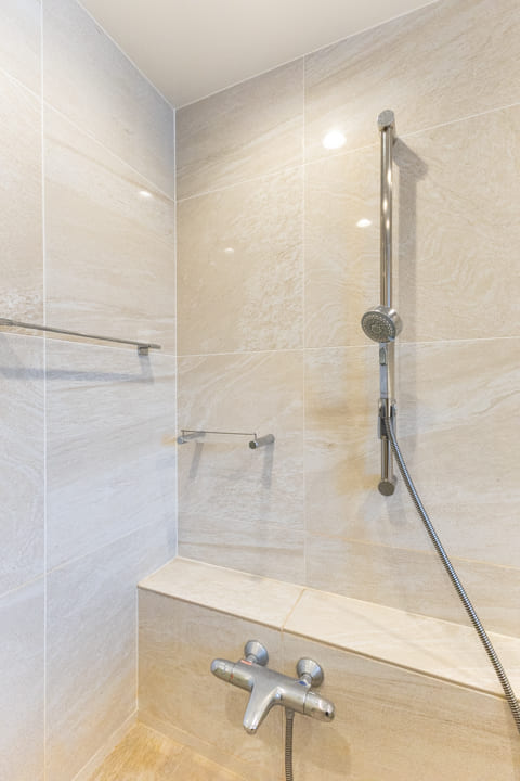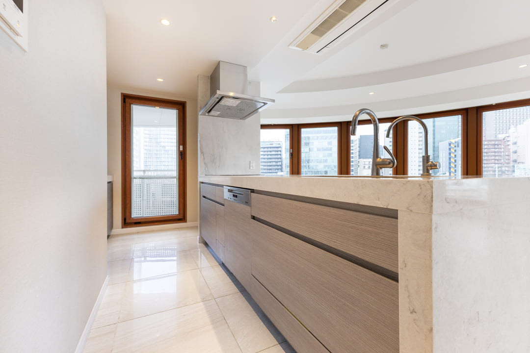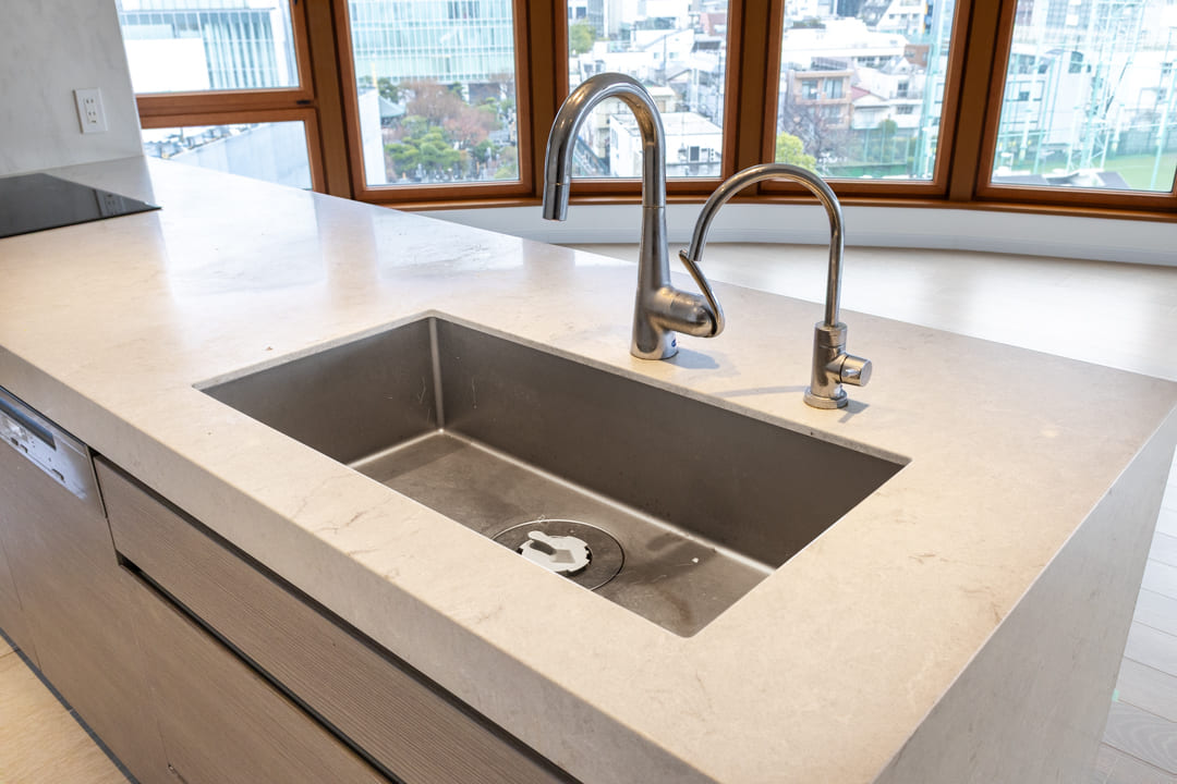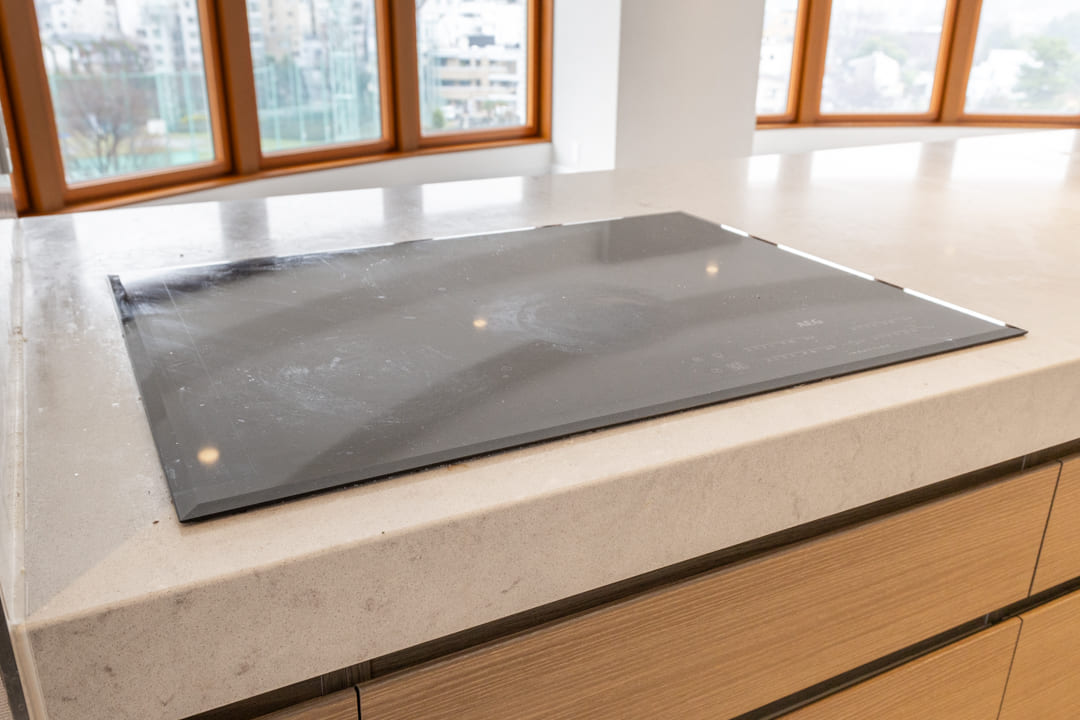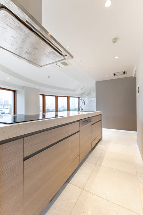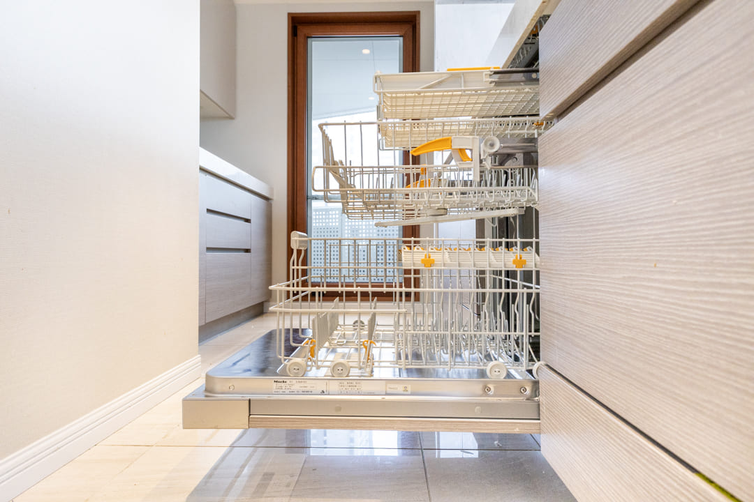 3口のIHクッキングヒーターやMiele(ミーレ)製の食洗機を完備。調理も後片付けも捗ります。IHはスイッチで火力を調節でき、ガスコンロよりも調整が簡単。凹凸がなくフラットでお手入れがしやすいのも魅力です。ディスポーザーも搭載されているので、掃除の手間が軽減され、悪臭の原因を防いでくれます。