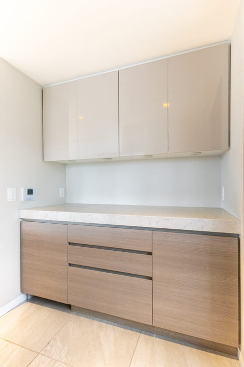 背面にはキッチンと同一デザインで揃えた大容量のカップボードを設置。統一感のある美しい空間を保ちながら、食料品や食器類をすっきりと収納できます。カウンター左右にはコンセントも設けられており、家電の使用にも配慮された設計です。