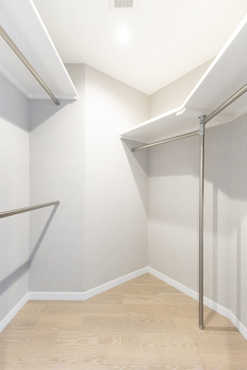 約1.8帖のWIC(ウォークインクローゼット)を備え、収納充実。衣類はもちろん、トランクケースやゴルフバッグといった大きな荷物も収納でき、居室空間を広々と使うことができます。ハンガーパイプが2段になっていて、丈の短い洋服を効率良く収納できるのも嬉しいポイントです。