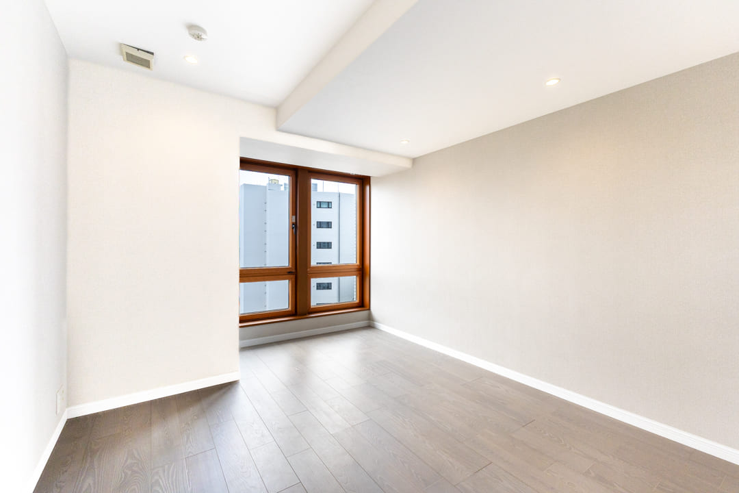 約12.3帖の広々とした寝室1。カーブを描く大開口の窓からは木々の緑が広がり、穏やかな印象をもたらします。シンプルな内装はインテリアの自由度が高く、ピクチャーレールを活用した空間演出も可能。さらにインターホンを備えており、急な来客時にもスムーズに対応できます。