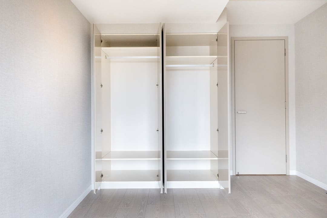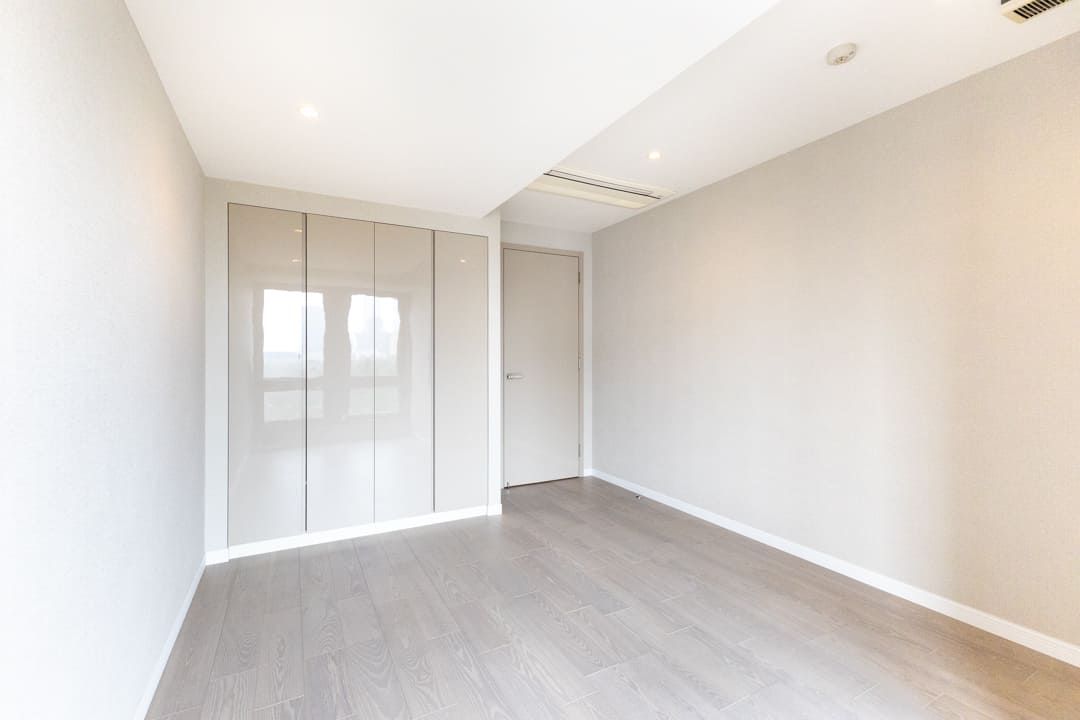 お隣にあるのは約8.5帖の寝室2。南東向きの大きな窓からやわらかな陽光が差し込み、明るく心地よい空間が広がります。こちらもビルトインエアコンを採用し、意匠性を損なわないすっきりとした印象に。クローゼットは棚板やハンガーパイプの高さ調整が可能で、衣類や小物を効率良く収納できます。
