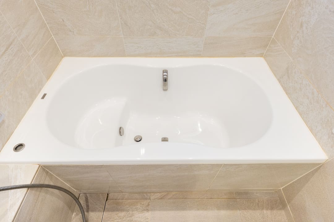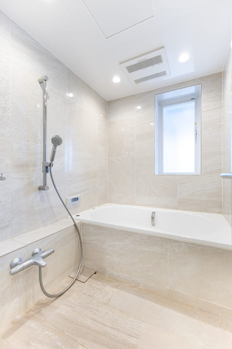 バルコニーに面した窓からやわらかな自然光が差し込む、開放感のあるバスルーム。自然換気が可能で、湿気がこもりがちな空間にも配慮された設計です。石柄の意匠が施された内装は、落ち着きと重厚感を感じさせる佇まい。換気・暖房・乾燥・涼風機能も備え、季節を問わず快適なバスタイムをお過ごしいただけます。