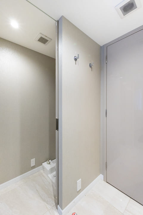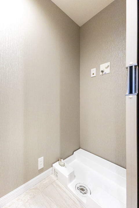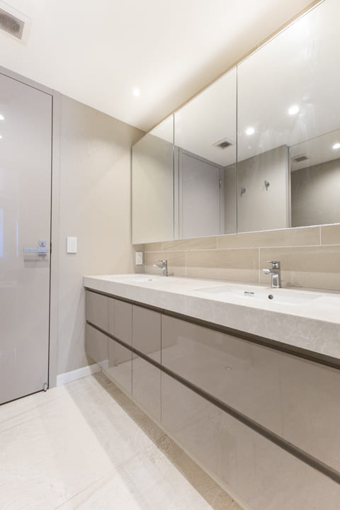 ホテルライクな2ボウル仕様の洗面化粧台。2人並んで使用でき、忙しい朝の身支度も落ち着いて行うことができます。ミラーボックスと引き出し、背面にはリネン庫を備え、豊富な収納も魅力。いつも清潔な洗面室をキープできます。洗濯機置き場には扉があり、生活感をさりげなく目隠しできるのもポイントです。