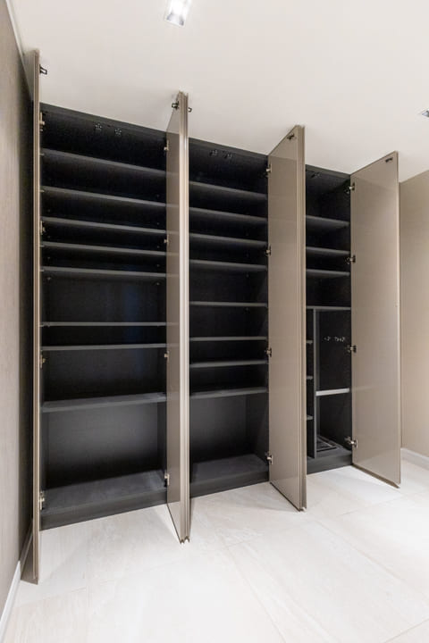 石柄タイルが空間に品格を添える玄関ホール。大きな全身鏡が奥行きを演出し、実際以上の広がりを感じさせます。靴を履いたまま身だしなみを整えられるのも嬉しいポイント。対面にはトールタイプのシューズボックスを備え、可動棚によりロングブーツや雨具もすっきりと収納可能です。さらに、廊下には約0.7帖の納戸を設け、季節家電やアウトドア用品などの保管にも対応します。