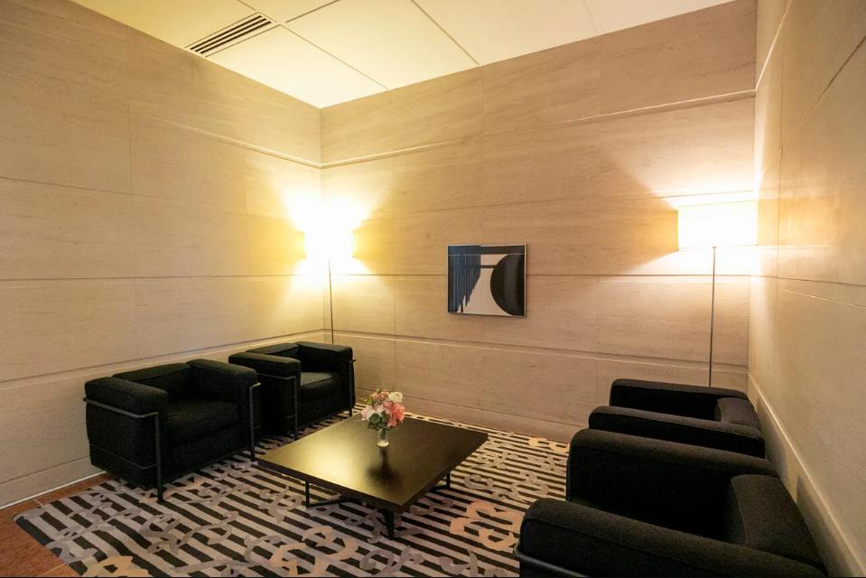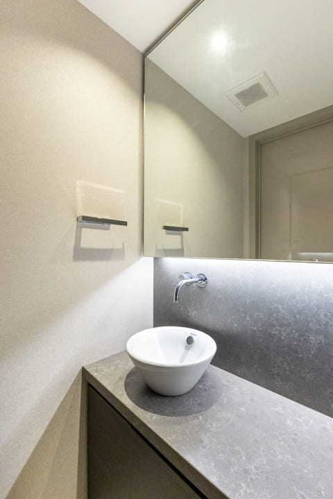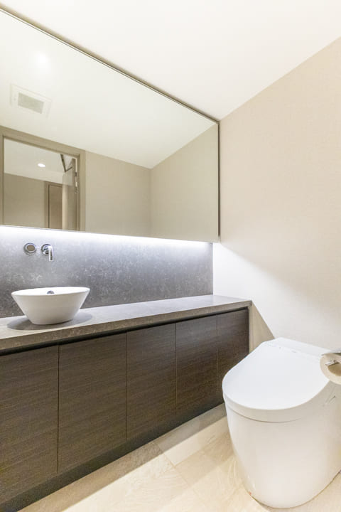 廊下に面し、独立性を確保したレストルーム。手洗いカウンターに配された間接照明がやわらかな陰影を生み、上質な雰囲気を漂わせます。使用後すぐに手を洗える動線にも配慮。タンクレス仕様の洗浄機能付トイレを採用し、空間全体をすっきりと美しくまとめています。