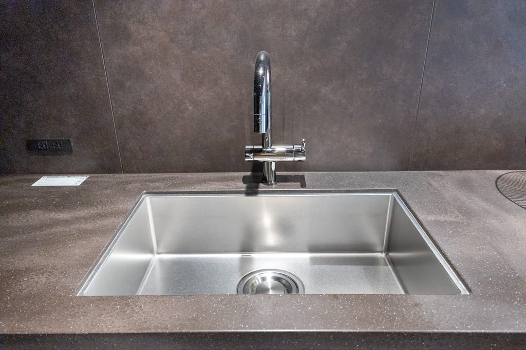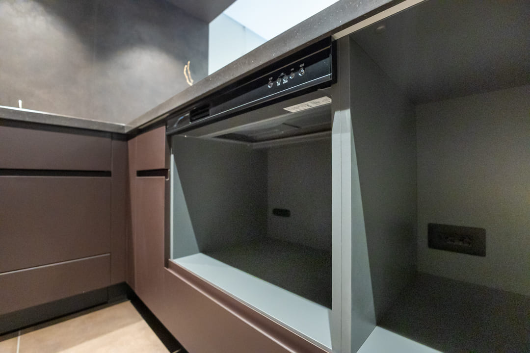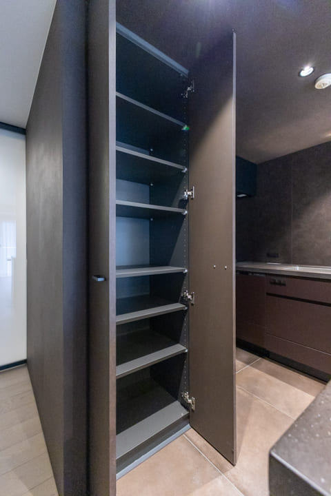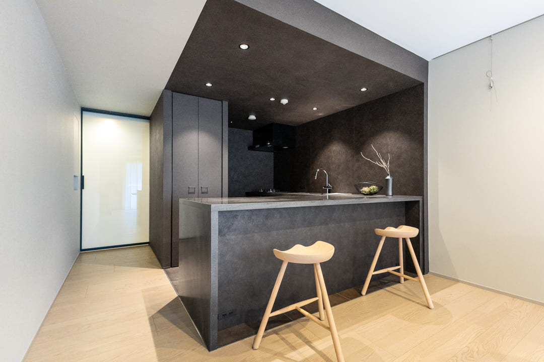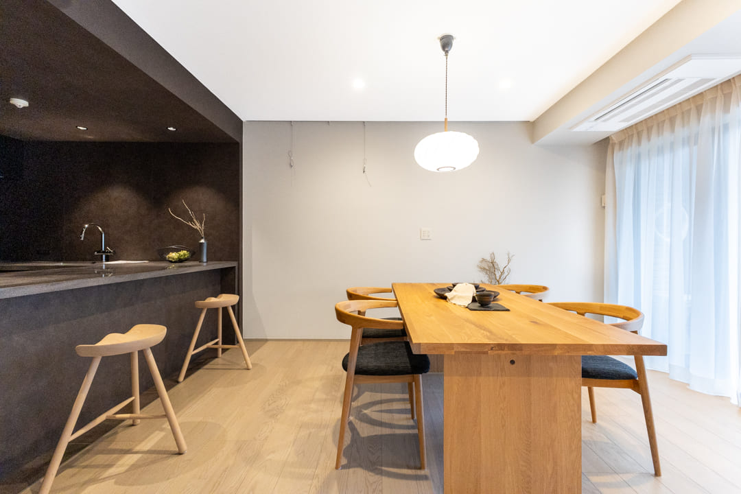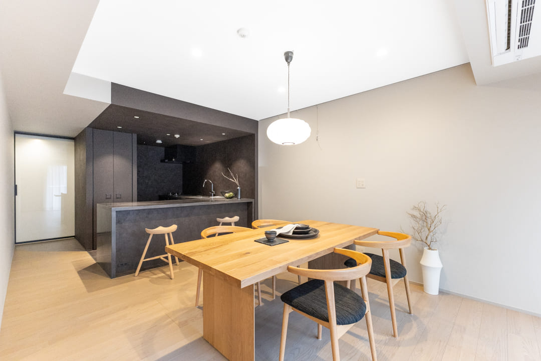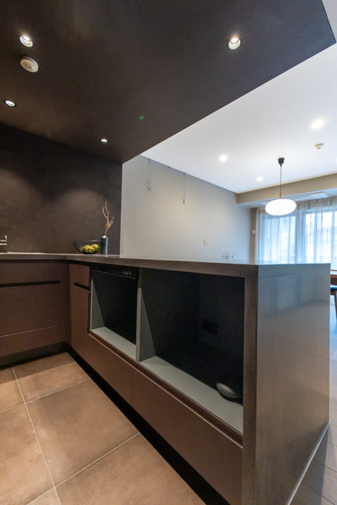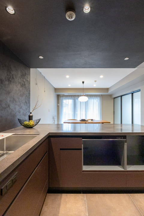 ダークグレーで統一された、シックな印象のキッチン。ゆとりあるカウンターを備えたL型レイアウトで、複数人での調理もスムーズに行えます。リビングダイニングを見渡せる開放的な配置も魅力のひとつ。リビング側のカウンターは、スツールを添えれば軽食やティータイムを楽しめるスペースとしても活用できます。料理をしながら会話を愉しむ、穏やかな時間が広がります。