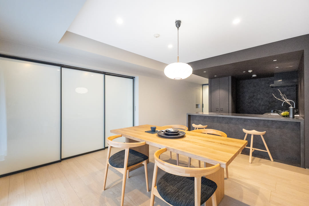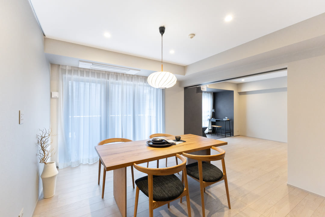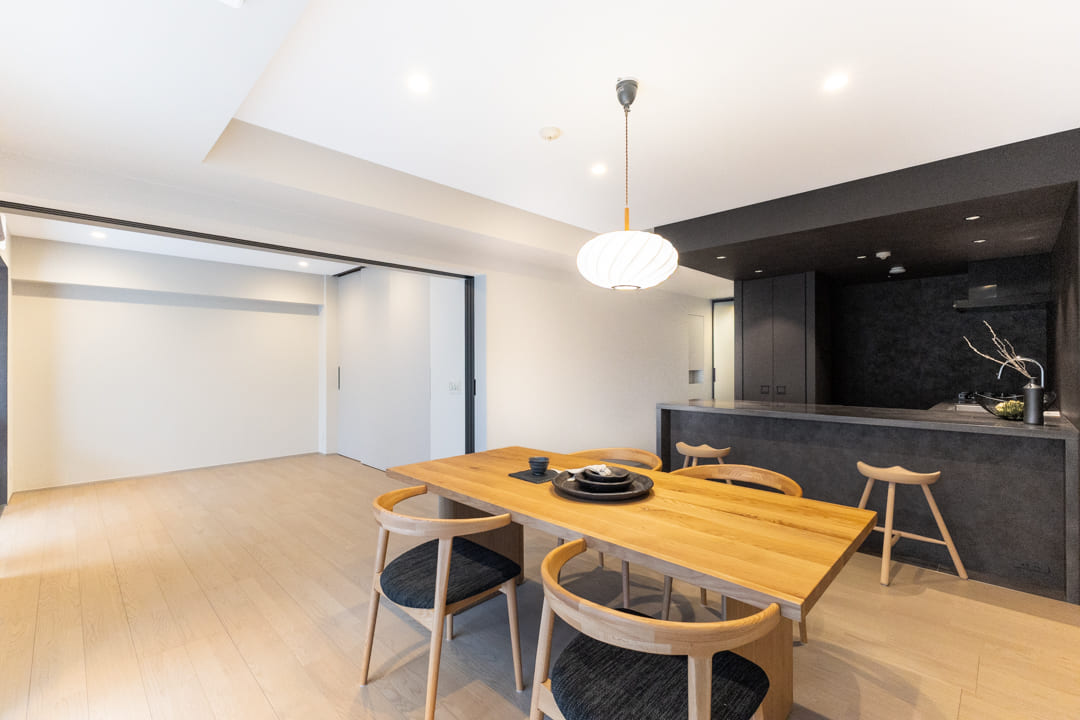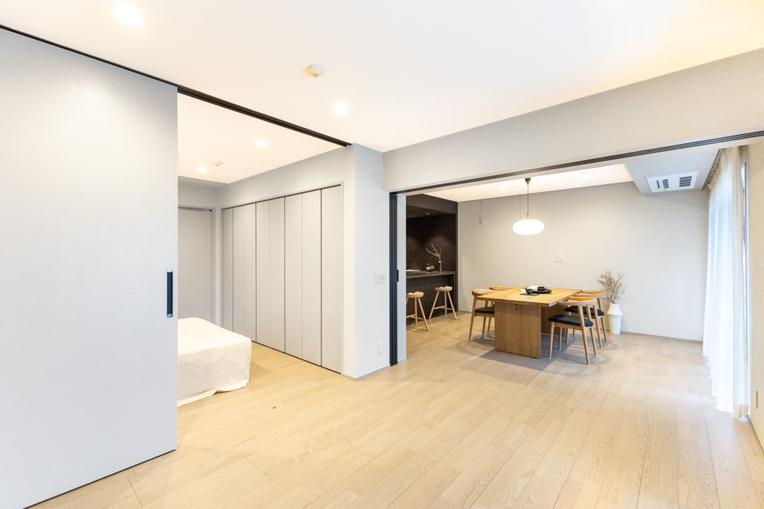 隣接する洋室1との間仕切り戸を開放すれば、23帖超のゆとりある一体空間に。視線が抜け、より伸びやかな印象へと変わります。来客時にはゆったりとおもてなしができる、柔軟性のある間取りです。