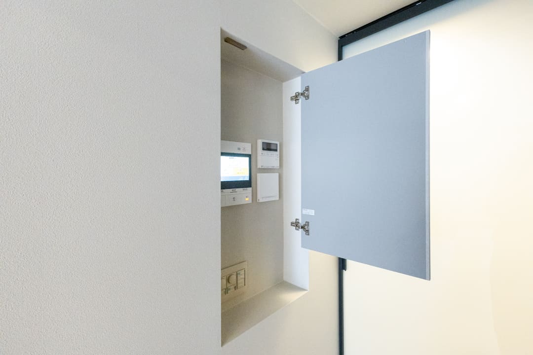 インターホンやスイッチをまとめたニッチスペースには扉を設け、生活感をさりげなくカバー。空間の印象をすっきりと保てます。ピクチャーレールも備わっているので、ポスターやエアプランツなどを飾りながら、自分らしいインテリアづくりを楽しめます。