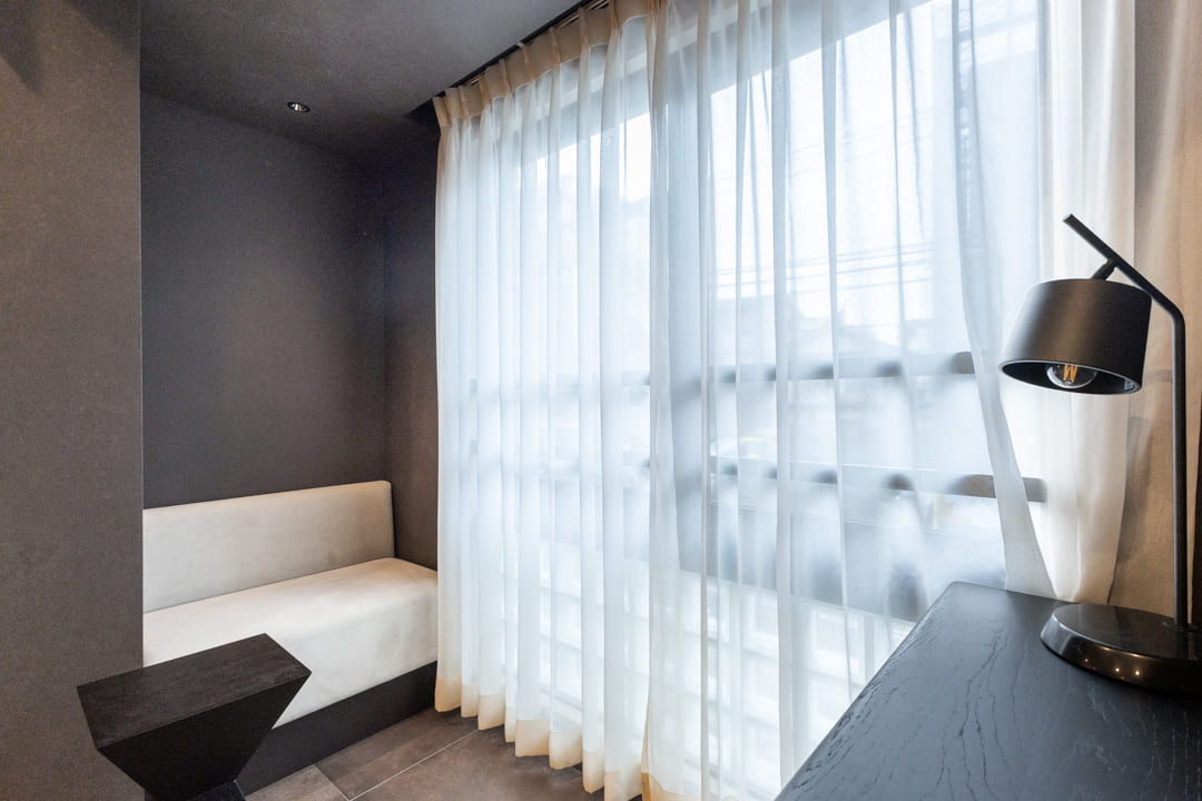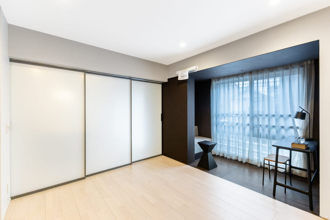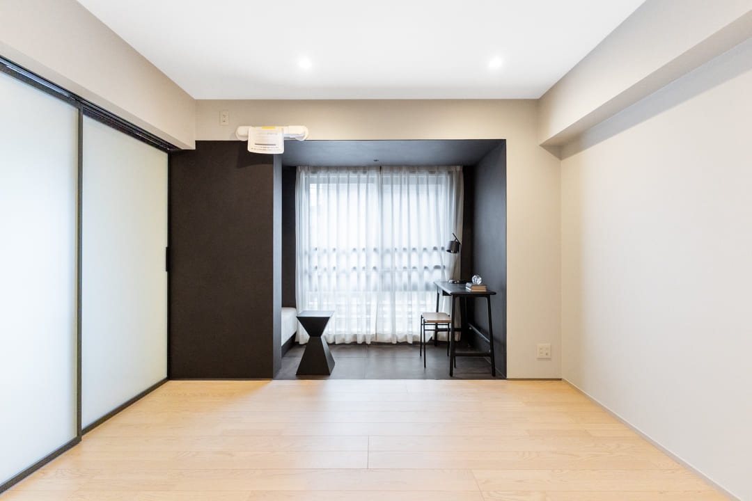 窓際には、あたたかな光が差し込むヌックを設けました。小ぢんまりとした居心地の良い空間に、こもり感のあるソファを備え付け。読書やちょっとした休憩など、自分だけの時間をゆったりと楽しめます。空間全体はブラックを基調とし、ほどよく引き締まった印象に仕上がっています。