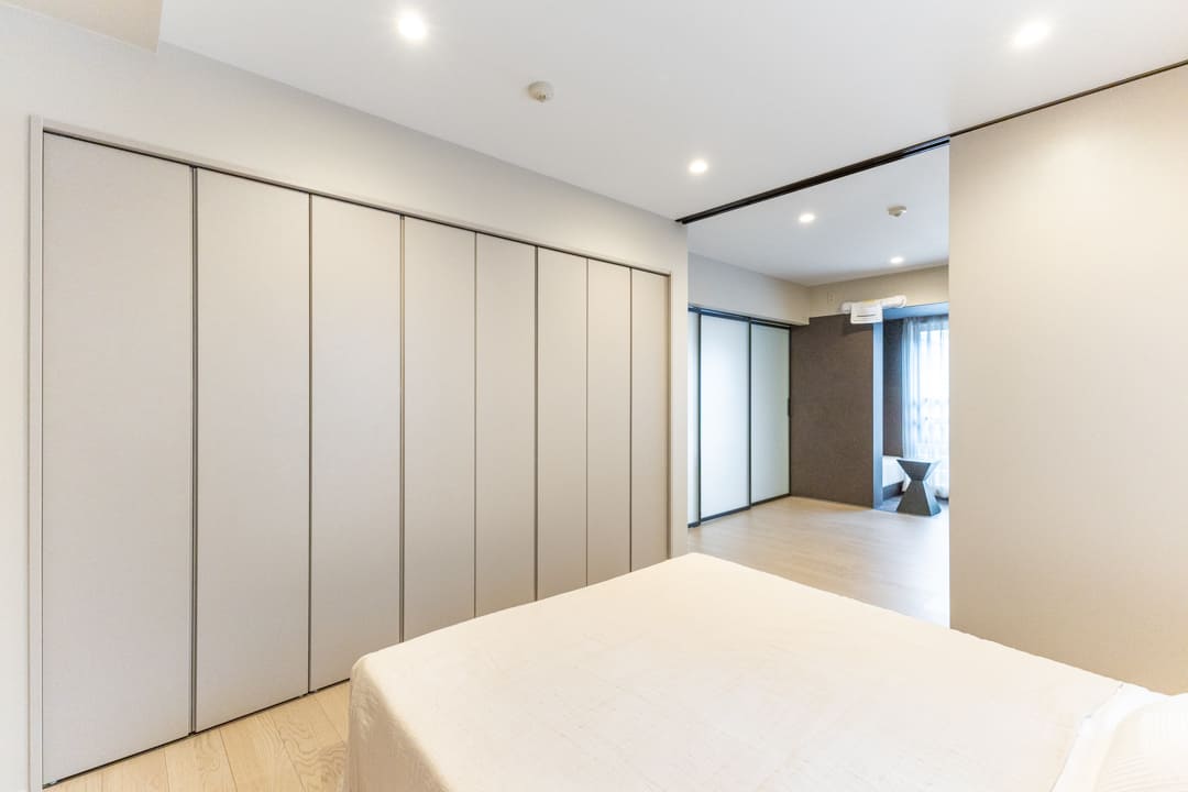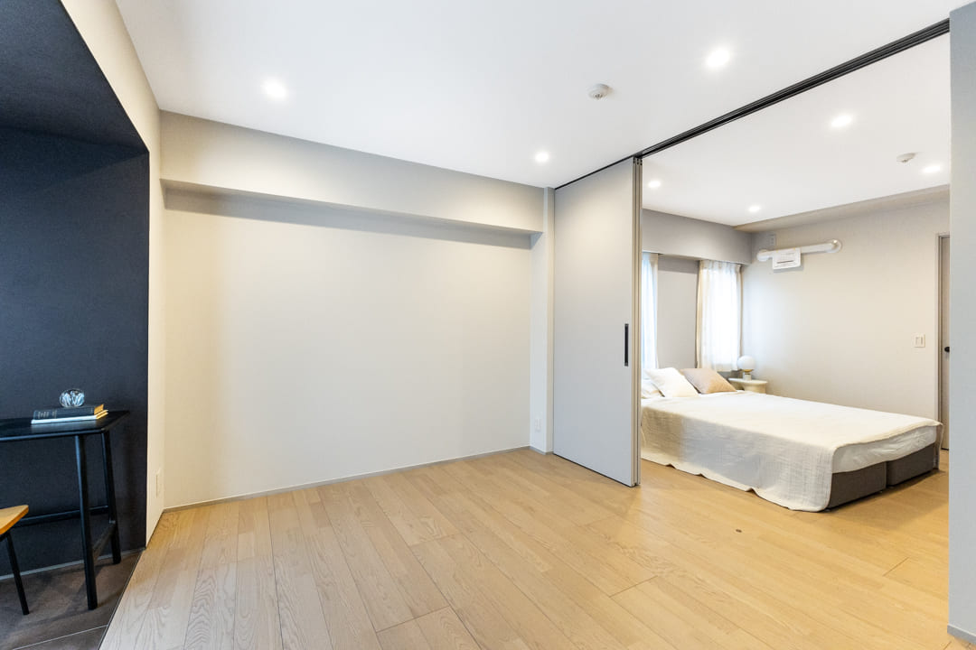 約7.8帖の洋室1。LDKと洋室2の両方に接続しており、住まいの中心に位置する使い勝手の良い一室です。間仕切りには引き戸を採用しているため、普段は扉を開け放ってLDKと一体で使うことも可能。空間に広がりが生まれ、より開放的に過ごせます。