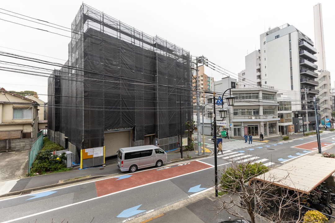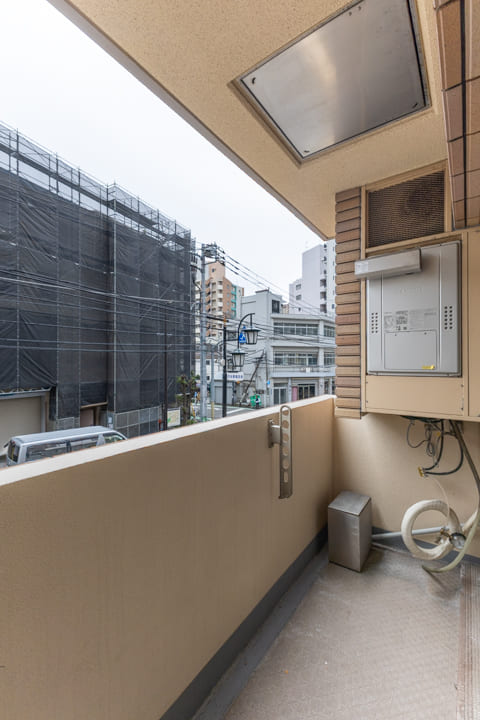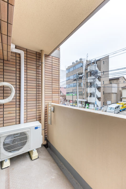LDKに面するバルコニー。4.12㎡のややコンパクトな空間ですが、道路に面しているため、抜けのある見晴らしです。撮影日はあいにくのお天気でしたが、南東向きで日当たり良好◎。晴れた日には洗濯物がよく乾きそうです。
