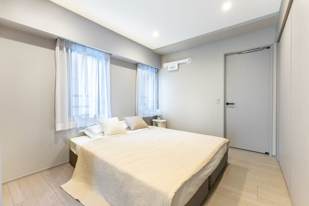 約5.6帖の洋室2。洋室1と廊下の両方から出入りできる、回遊性の高いレイアウトが特徴です。南西向きの窓からはやわらかな光が差し込み、明るく心地よい空間に。主寝室として使いやすい一室です。