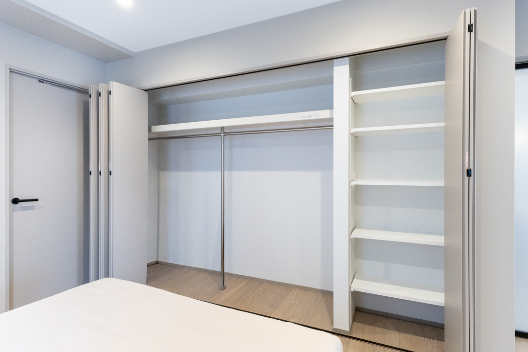 壁一面に設けられたクローゼットは、収納力も充分。内部にはハンガーパイプと可動棚を備え、洋服はもちろんバッグや小物類もすっきり整理できます。暮らしやすさに配慮された仕様です。
