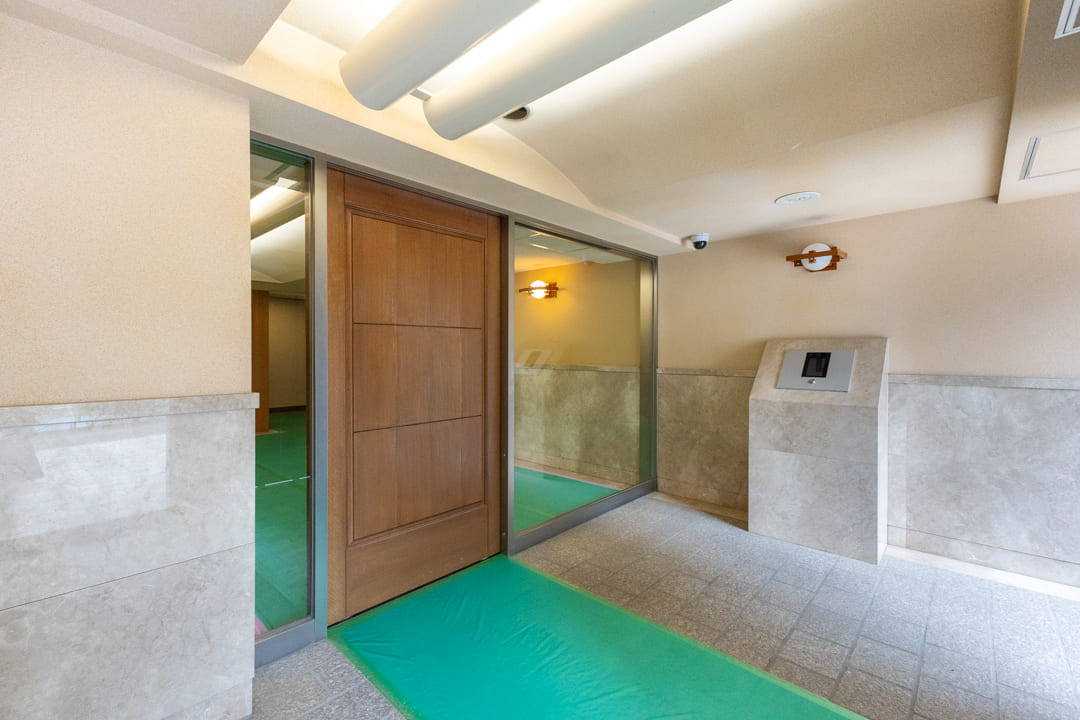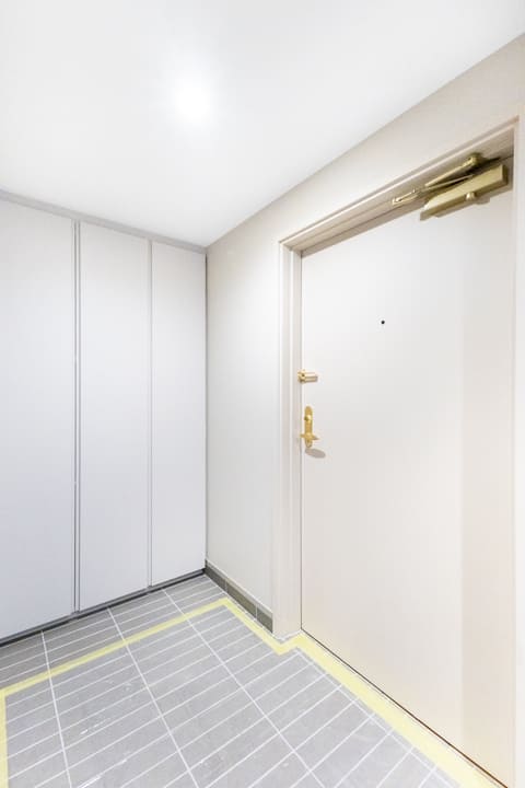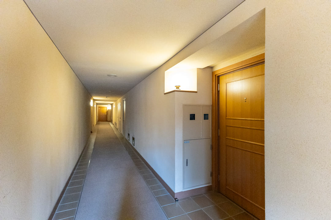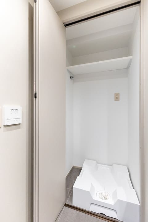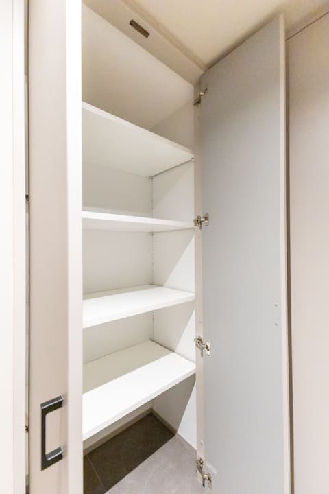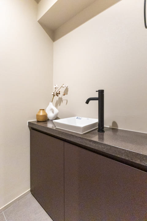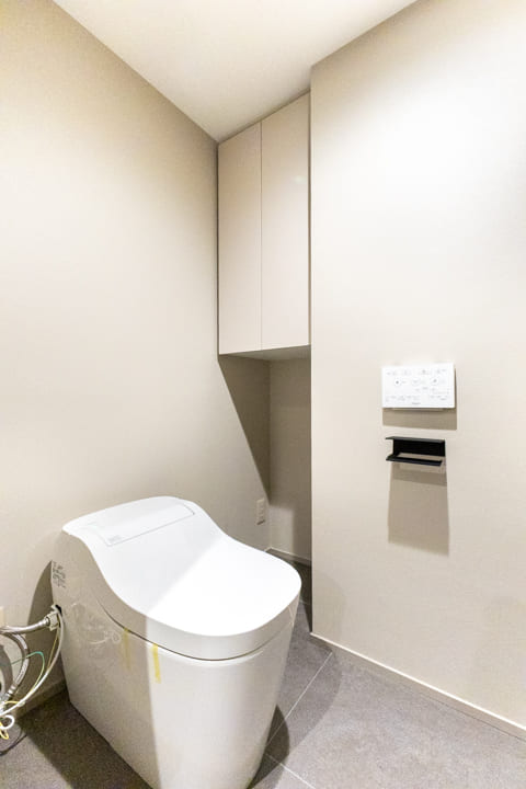 廊下に面していて独立性の高いレストルーム。Panasonic製の洗浄機能付トイレに新規交換済みです。タンクレス仕様でスタイリッシュ。奥には収納力のある吊戸棚を備え、トイレットペーパーや掃除用品をすっきりと収めることができます。手洗いカウンターも設置されているため、ゲストを洗面室まで案内する必要がなく、スマートにお使いいただけます。