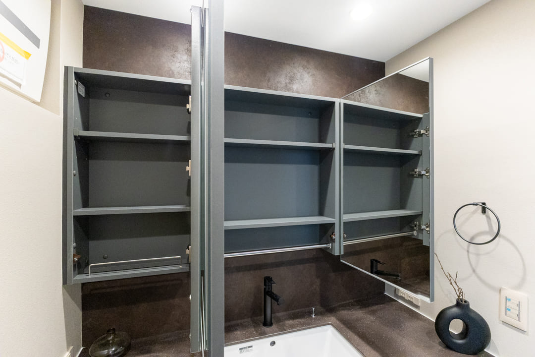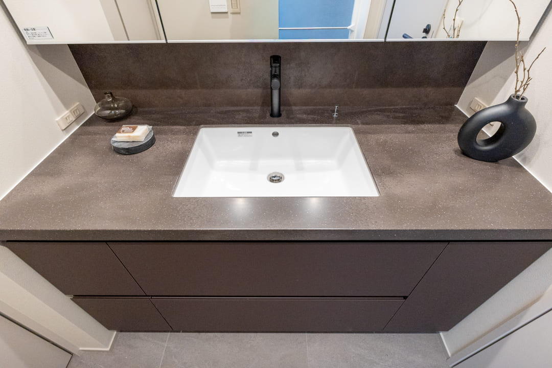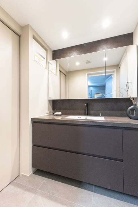 ダークグレーを基調とした、ホテルライクな洗面化粧台。カウンタースペースにゆとりがあり、化粧品やドライヤーの仮置きが可能です。忙しい朝の身支度も落ち着いて行えそうですね。洗面まわりの小物はミラーボックスにすっきり収納。奥に位置する洗濯機置き場には扉が付いていて、生活感を目隠しできます。