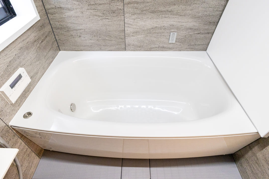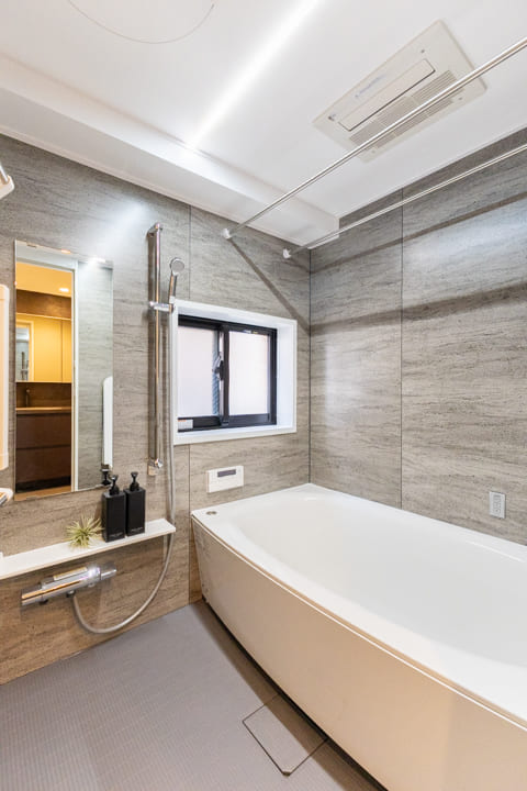 1418サイズのバスルーム。ライン照明が空間をスタイリッシュに照らします。窓付きのため自然換気が可能で、湿気がこもりがちな空間にも配慮された設計。換気乾燥暖房機・追い焚き機能搭載で、1年中快適なバスタイムをお過ごしいただけます。