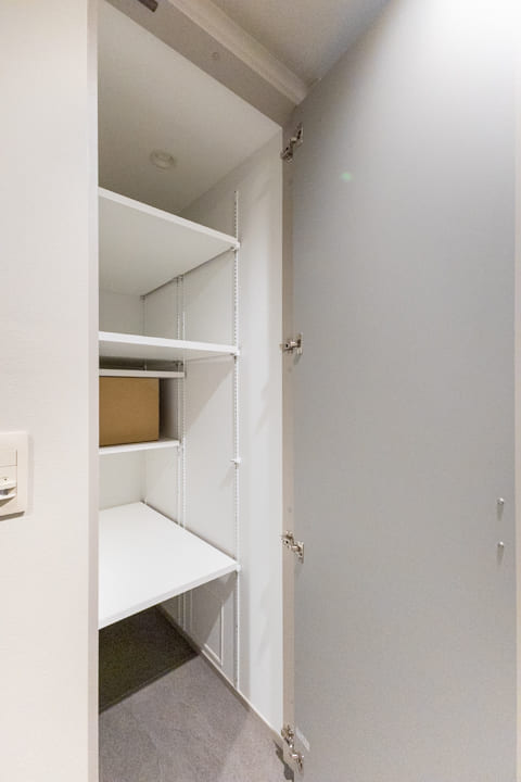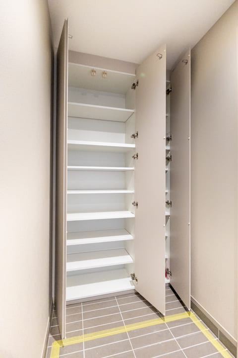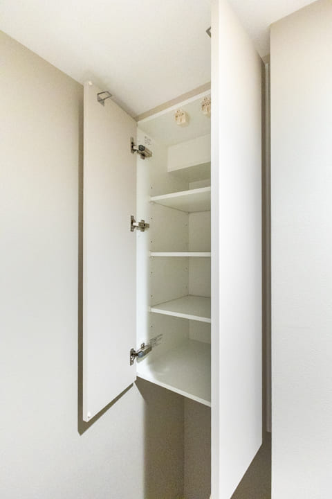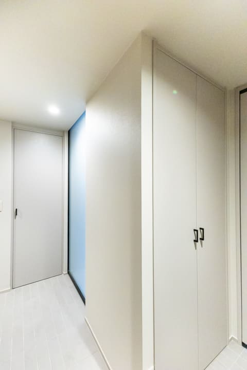 白を基調で明るく清潔感のある玄関ホール。人感センサー付き照明が、帰宅時をやわらかな光で迎えてくれます。荷物で両手が塞がっている時や夜遅く帰宅した時に、スイッチを探す手間がかからず助かりますね。トールタイプのシューズボックスを備え、収納充実。廊下にも収納が2つあり、ペットグッズや日用品ストックの収納に便利です。