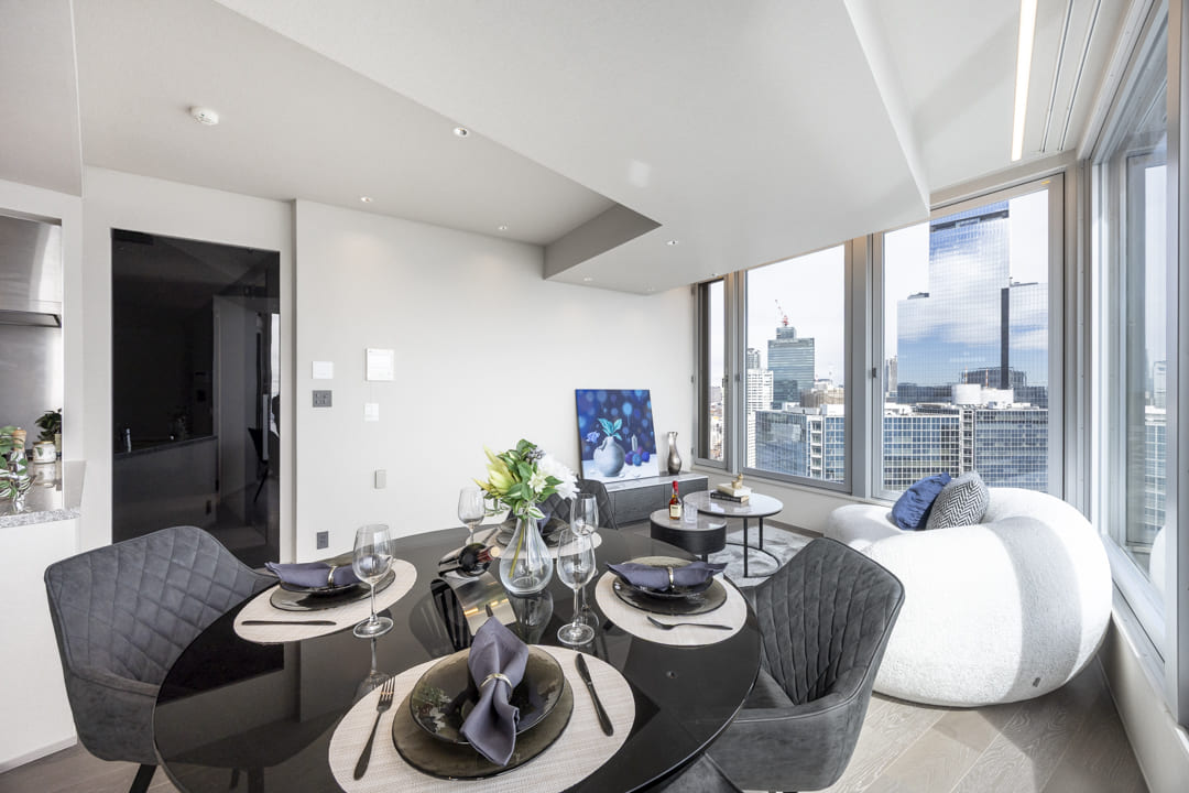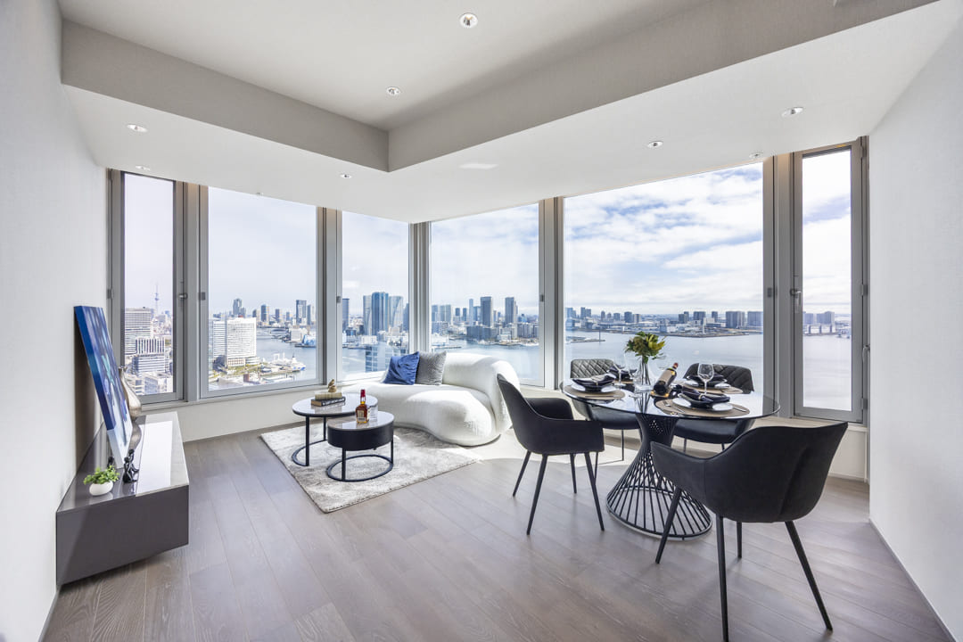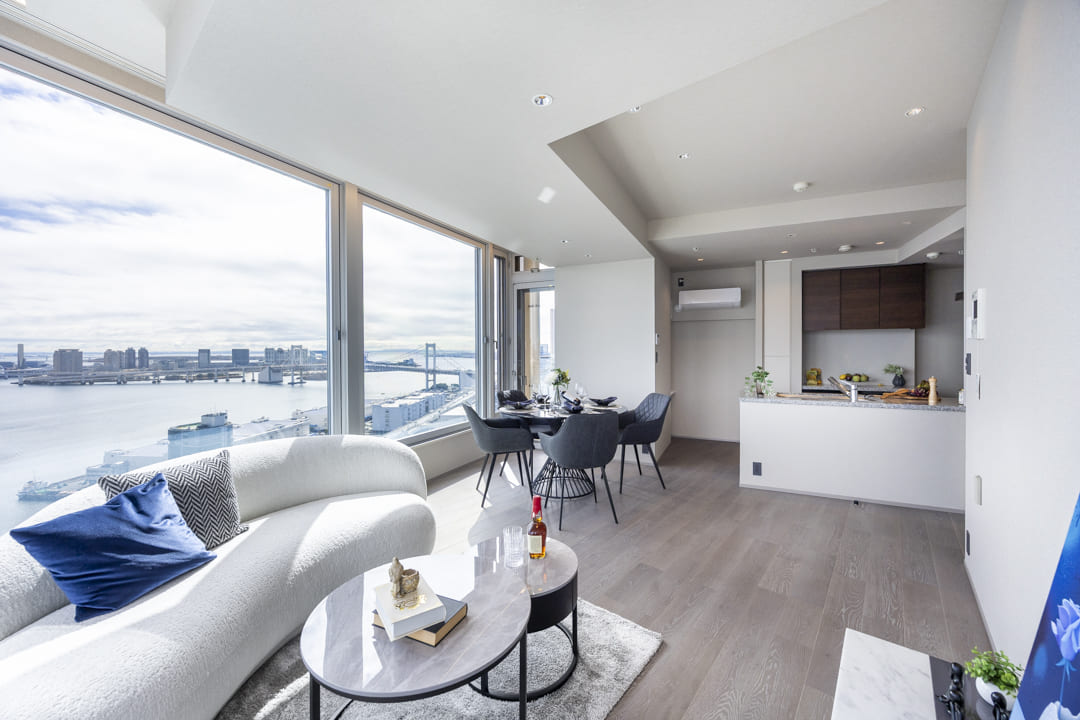 約16.4帖の広々としたリビングダイニングキッチンです。大きな窓に囲まれており、海上に美しいアーチを描くレインボーブリッジや堂々とそびえる東京スカイツリーを同時に望むことができ、昼夜でまったく異なる表情を楽しめます。