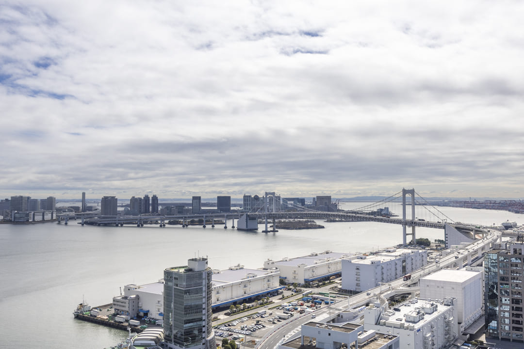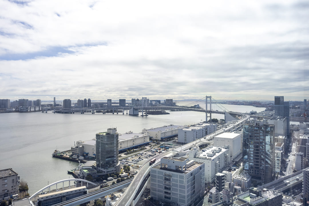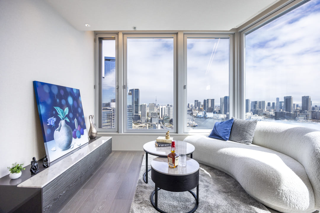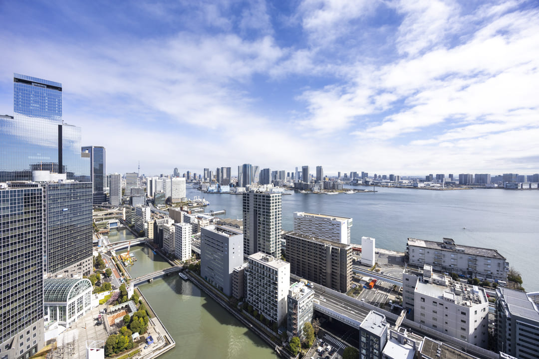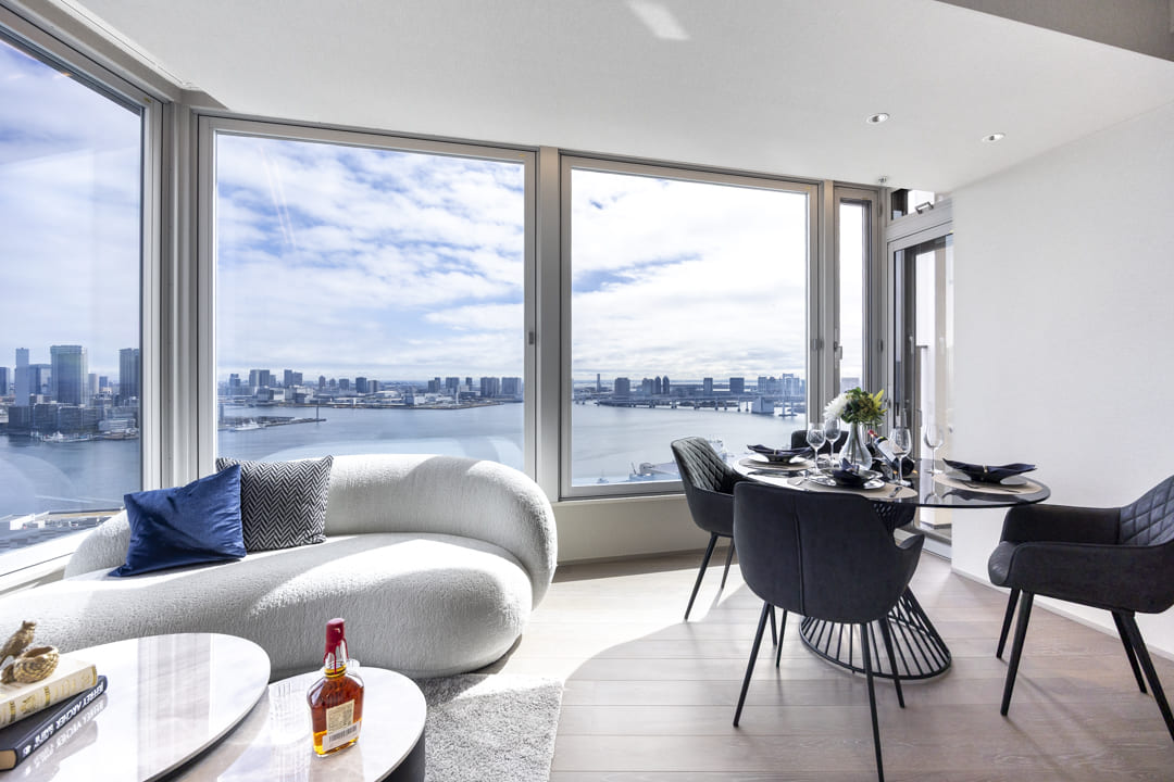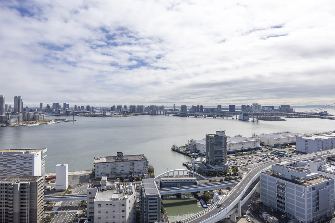 窓からは南東向きのバルコニーにアクセスができます。東京湾とレインボーブリッジが望め、晴れた日にはきらめく水面と広い空が開放感を演出し、夜には都心の灯りが宝石のように輝く贅沢な眺望へと変わります。