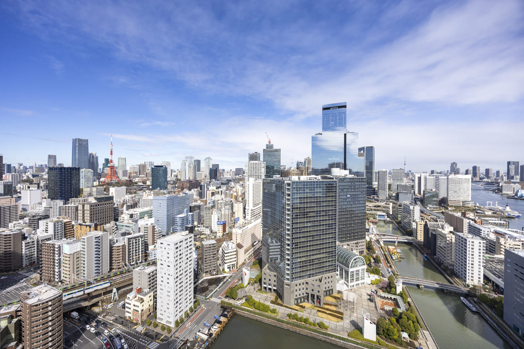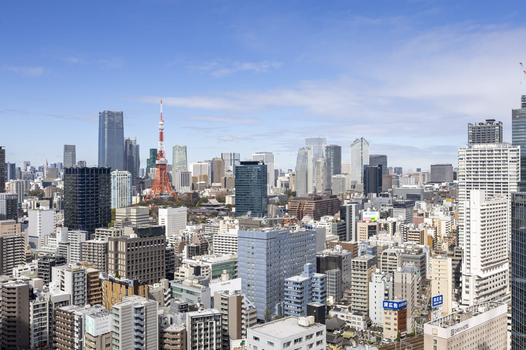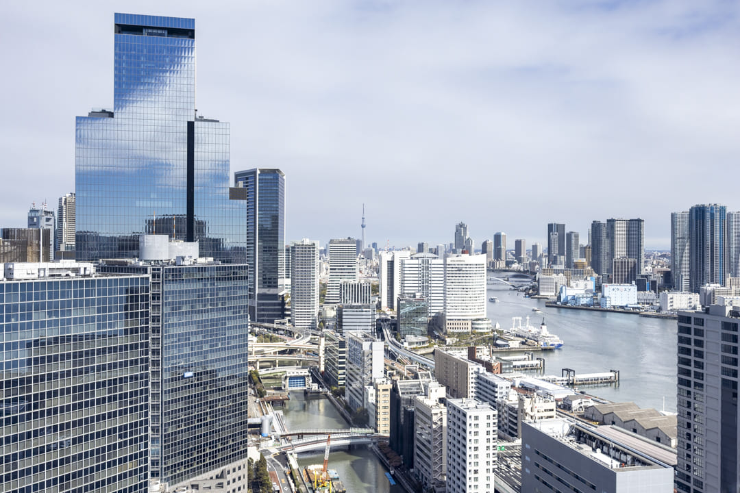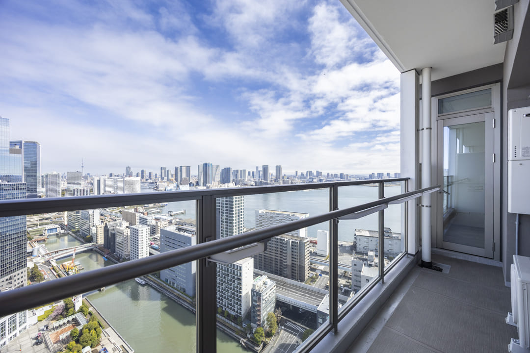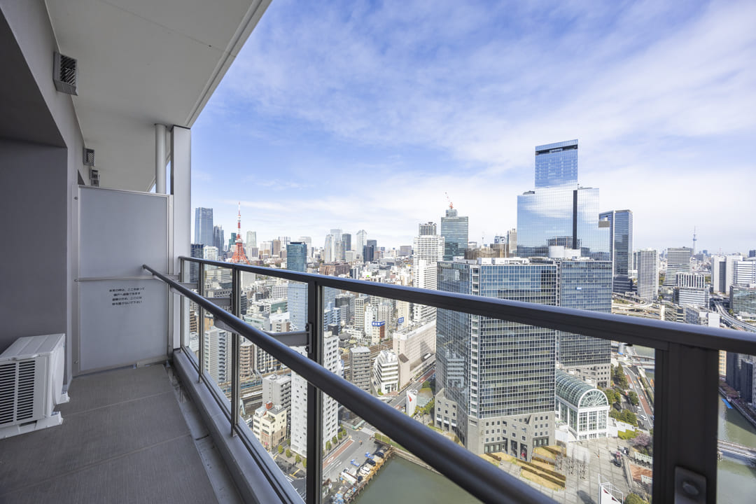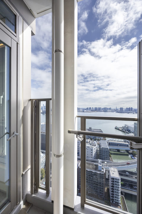 北東側のバルコニーはゆとりがあって、チェアなどを置いてほっと一息付けそうです。33階部分ということもあり、目の前には運河の潤いと東京タワー・東京スカイツリーの煌めきを感じる眺望が広がっています。