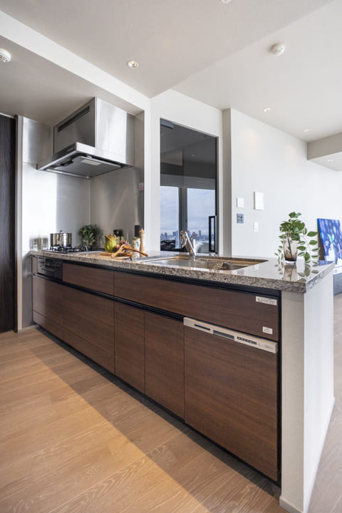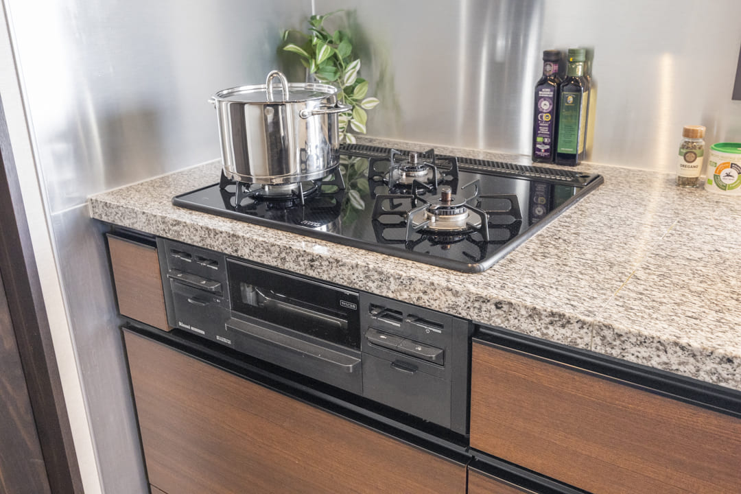 3口コンロ、グリル、ディスポーザー、食洗機付きと設備面も充実しています。シンクも広々としているので野菜などが洗いやすそうですよ。