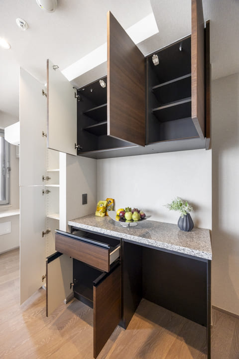 キッチンの背面側にはカップボードと棚が備え付けられています。調味料や食器などを収納できるだけでなく、電子レンジなどを置くこともできるので便利です。