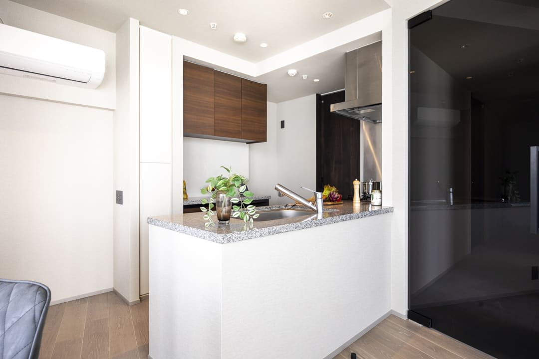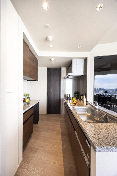 リビングダイニングを見渡しながら料理ができる対面式です。家族や来客とのコミュニケーションが取りやすくて◎。しかし、コンロ側には壁がたっているので、油跳ねなどの心配はありません。また、洗面室からも出入りができる便利な動線になっています。