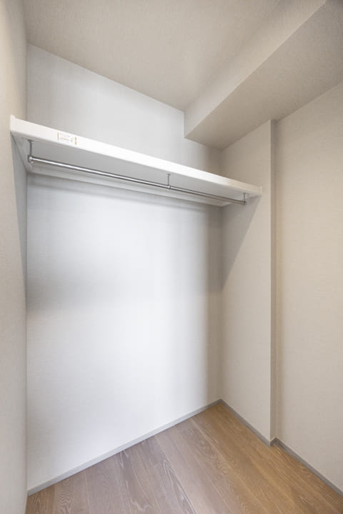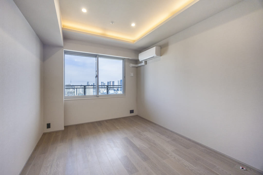 約6.7帖のゆったりと過ごせる主寝室です。天井には間接照明があしらわれていて、お部屋を上品な雰囲気に演出してくれています。窓からはスカイツリーが望めます。また、奥行きがあるウォークインクローゼット付きのため、洋服や大きめの荷物もきちんと収納できますよ。