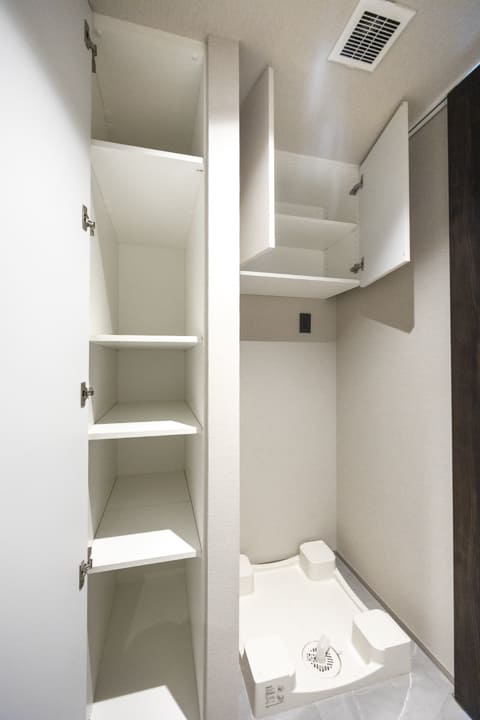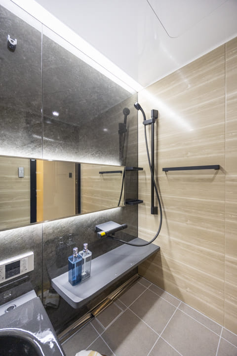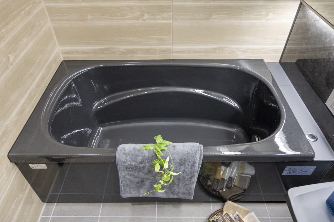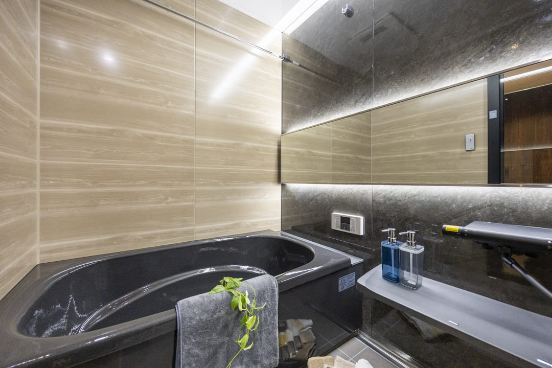 ブラックの浴槽や壁パネルが重厚感をもたらしているバスルームです。お風呂にゆっくり浸かるのが好きという方に嬉しい追い焚き機能を搭載。家族の入浴時間がずれてしまっても安心です。浴室乾燥機には暖房・乾燥・換気・涼風の機能がついており、一年中快適に過ごすことができます。また、照明には調光機能が付いているので、その日の気分に合わせて浴室の雰囲気を変えることができます。