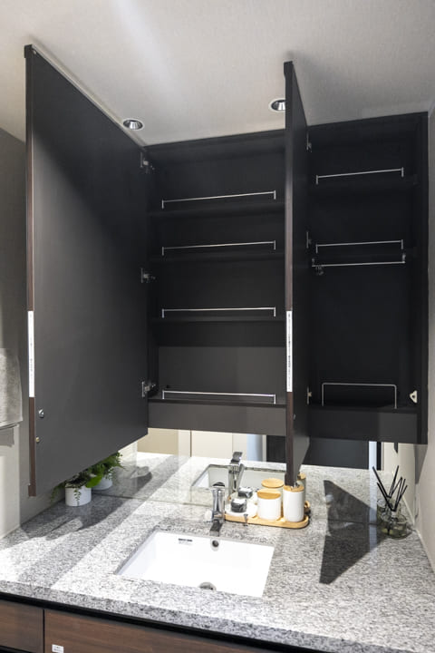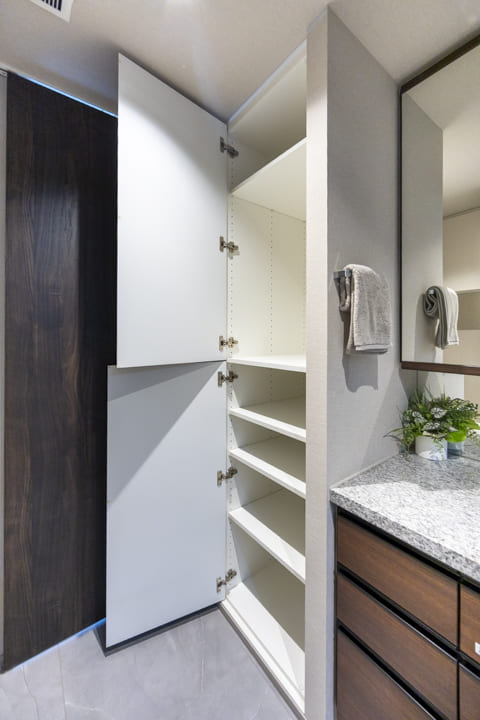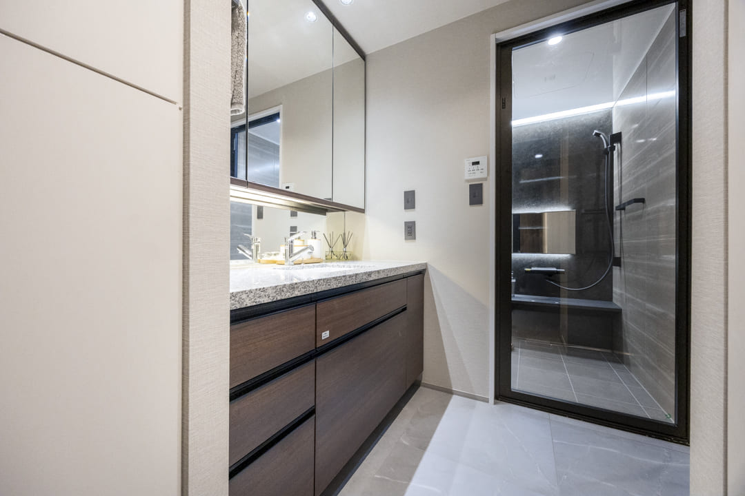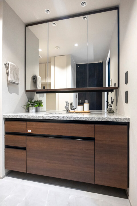 石目調のカウンターが高級感を漂わせている洗面化粧台です。大きな三面鏡の中には化粧品などが収納できて使い勝手良好。水栓の背面側も鏡になっているので、座りながらや背の低いお子さまでも鏡が見やすそうです。また、横や背面側にはリネン庫が造られており、ごちゃごちゃしがちな洗面まわりもきちんと整頓させることができますよ。