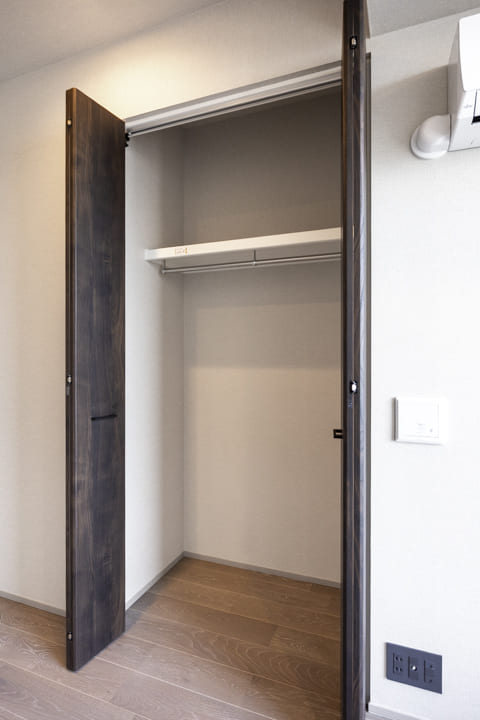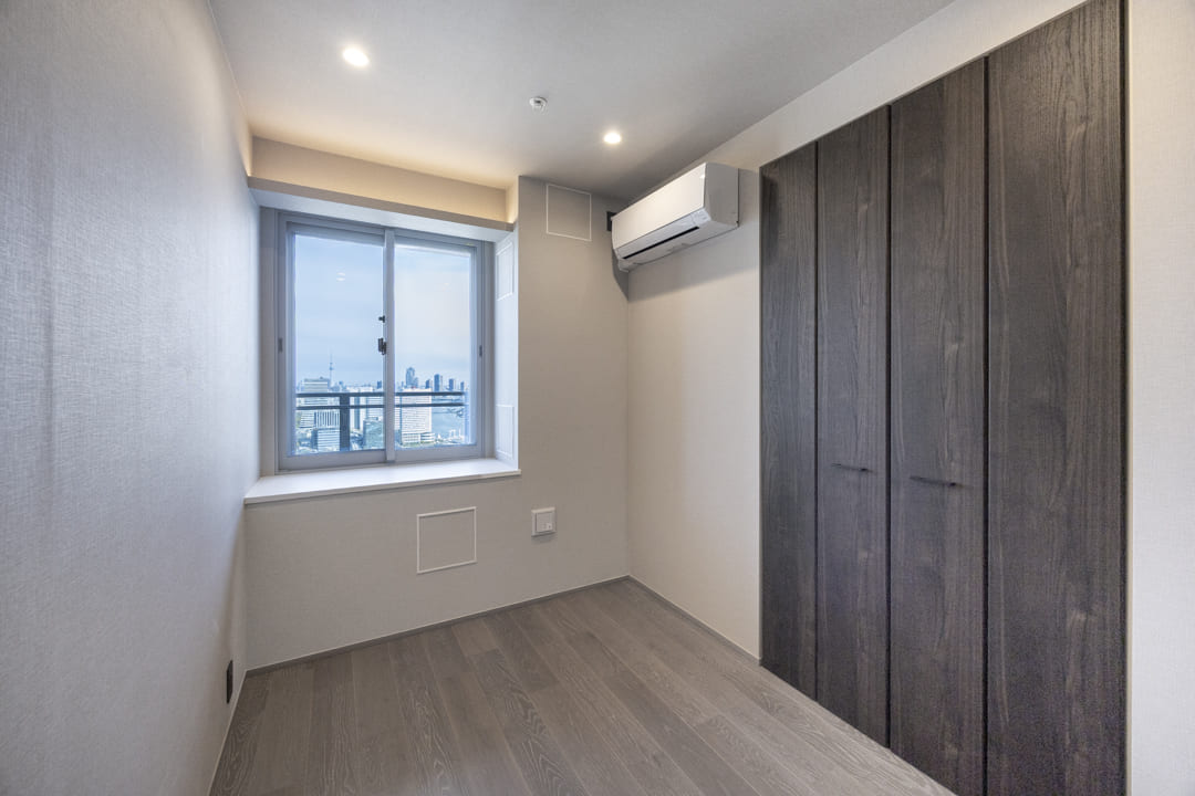 約4.7帖の寝室1は、独立性があって子ども部屋に良さそうな空間です。開口部が広めで物の出し入れがしやすいクローゼット付き。大きな窓からはスカイツリーを望むダイナミックな眺望が堪能できます。