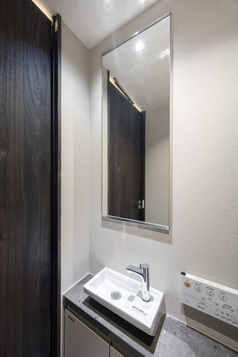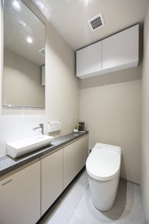 ウォシュレット一体型のトイレです。タンクレスタイプなのですっきりとした印象に。また、別途で手洗い器と鏡が造られているので、その場でサッと身だしなみを整えることができます。上部には吊戸棚が設置されていて、収納スペースもありますよ。カウンタースペースにはアロマなどを置いても◎。