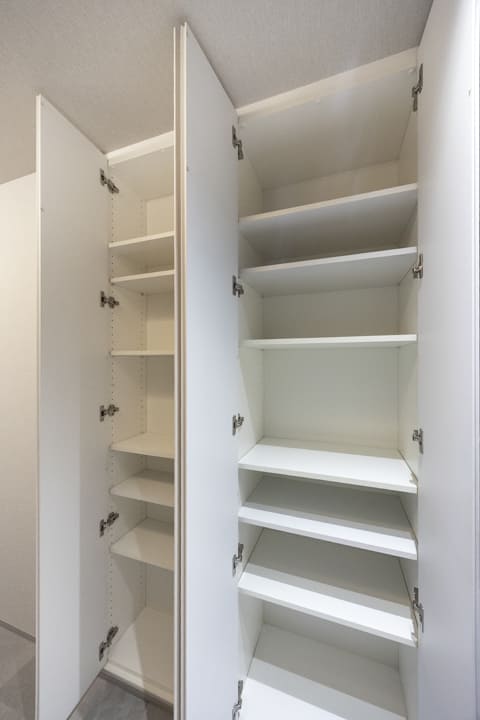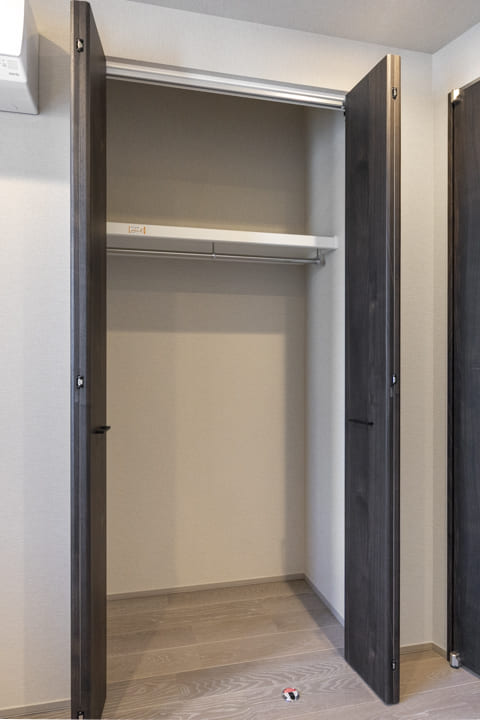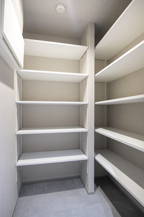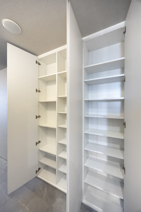 玄関入って左側にはシューズインクローゼットが造られています。中には可動棚が設置されており、たくさんの靴を収納することができます。スーツケースやベビーカーなども置けそうですよ。