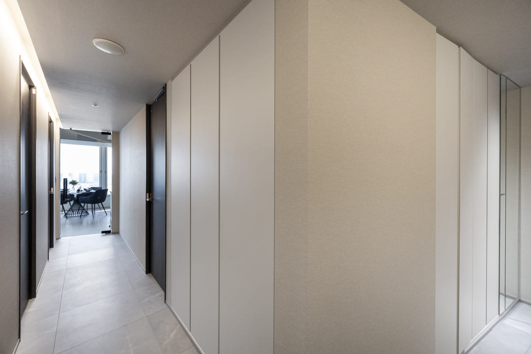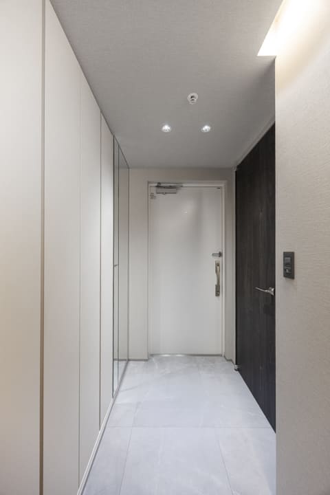 玄関や廊下には生活感が出がちな小物を収納できる棚が造られています。荷物をきちんと収納できると居住スペースをより有効的に使うことができるので嬉しいですね。玄関入って右側の棚には鏡が設置されているので、出かける際に全身のコーディネートをチェックできます。
