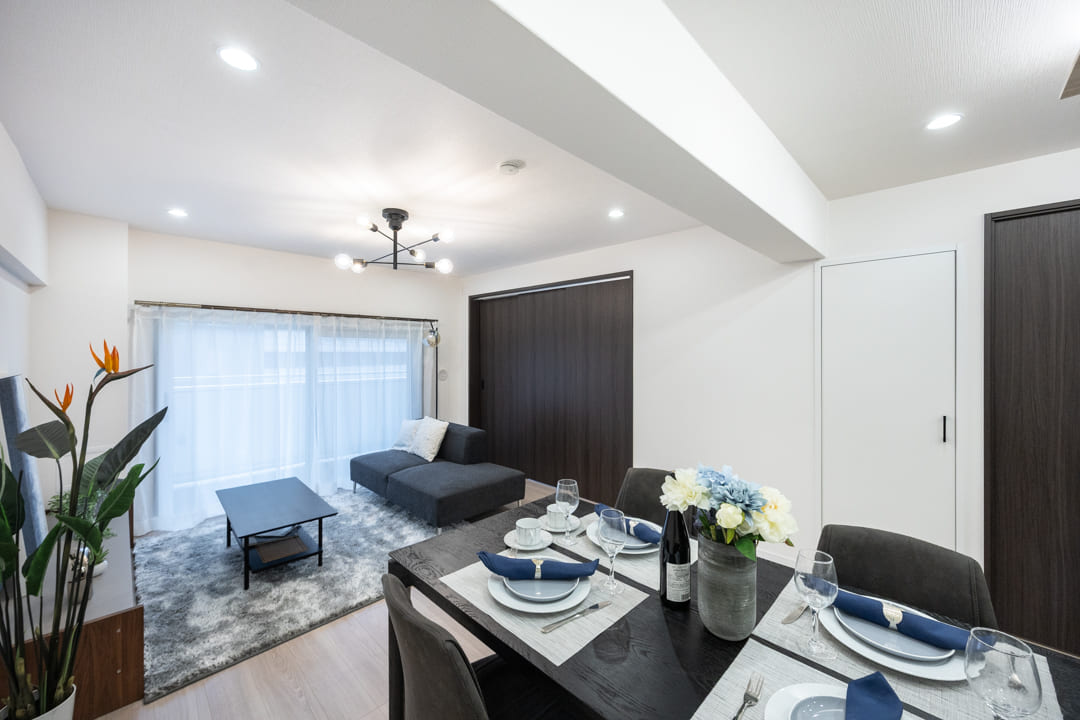 キッチンスペースを含めて、約16.3帖のリビングダイニング。南東向きのバルコニー窓からあたたかい自然光が降り注ぐ空間です。白基調のクロスを採用した清潔感のある内装に、はっきりとした木目が美しい建具でアクセントを。やわらかな光と木の温もりが調和し、毎日の暮らしを心地よく包み込みます。