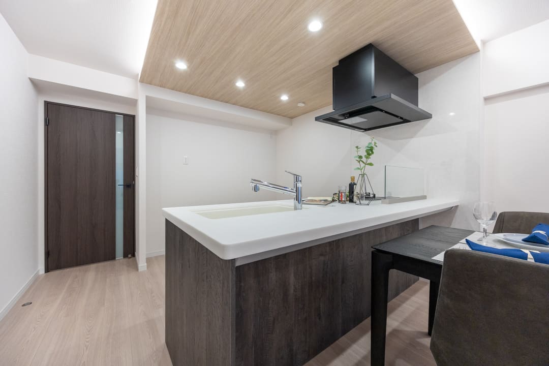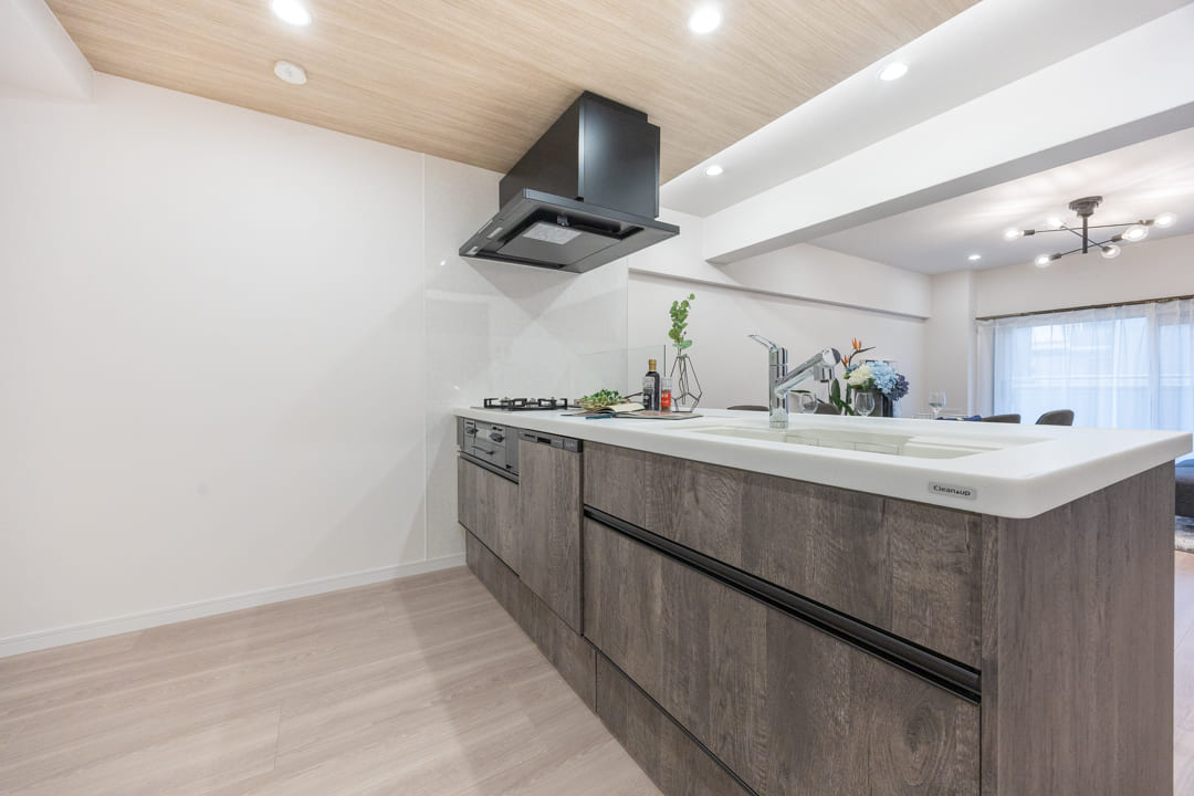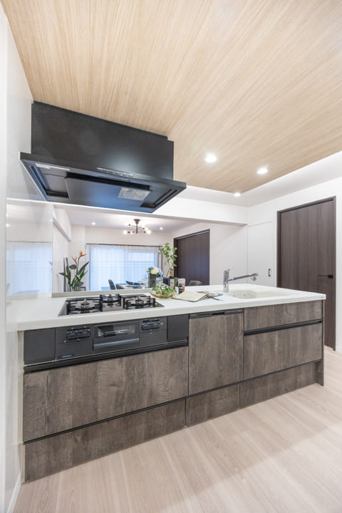 木目のアクセント天井や間接照明が洗練された空間を演出。開放的な気分で調理ができる、人気の対面キッチンです。家族との会話も自然と生まれ、暮らしのコミュニケーションを豊かにしてくれます。コンロ前には油跳ねガードが設置されていて安心です。