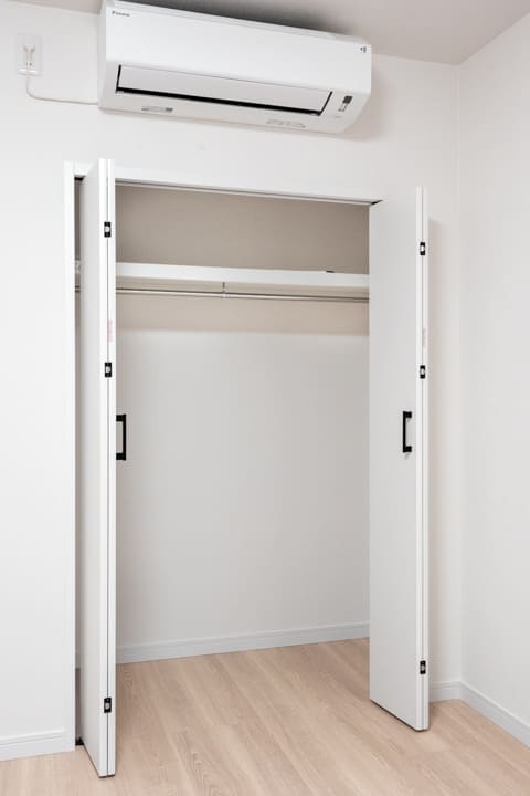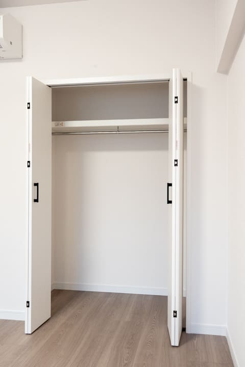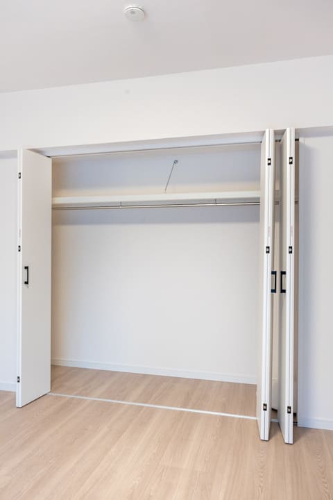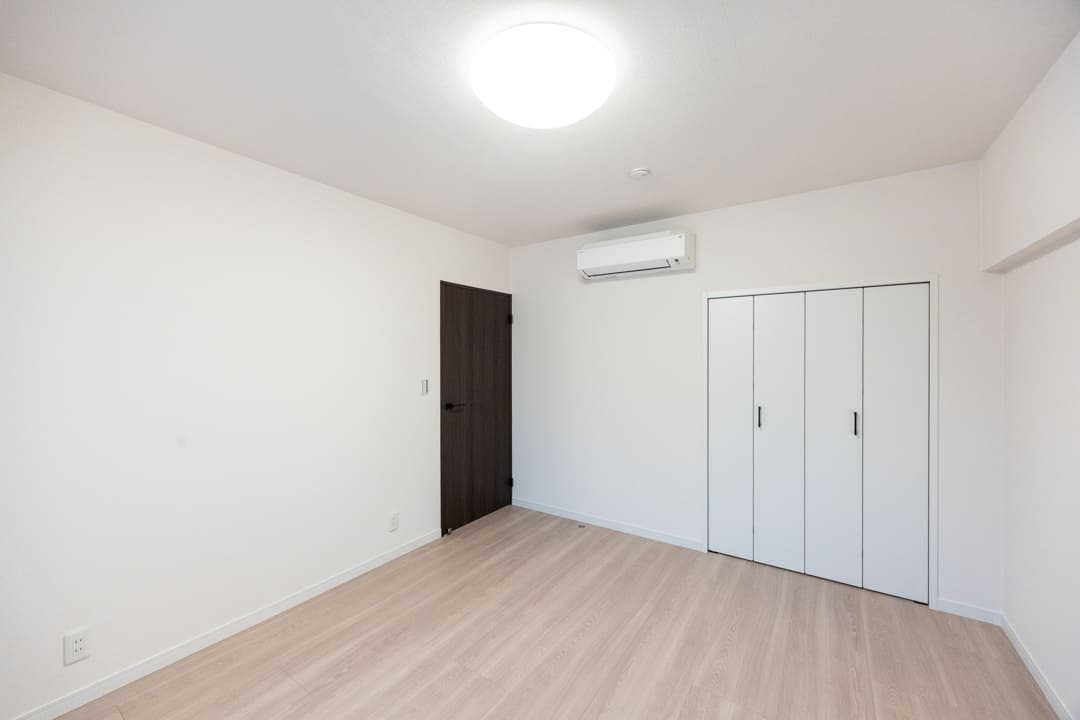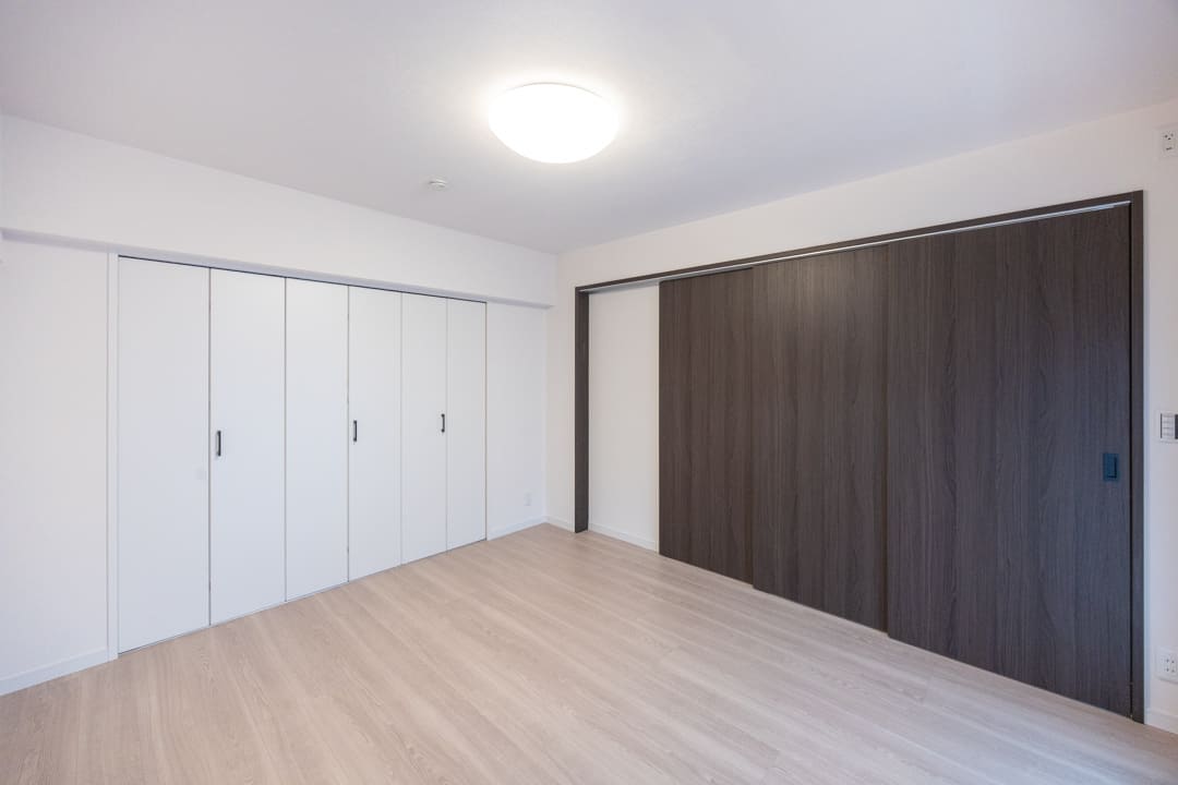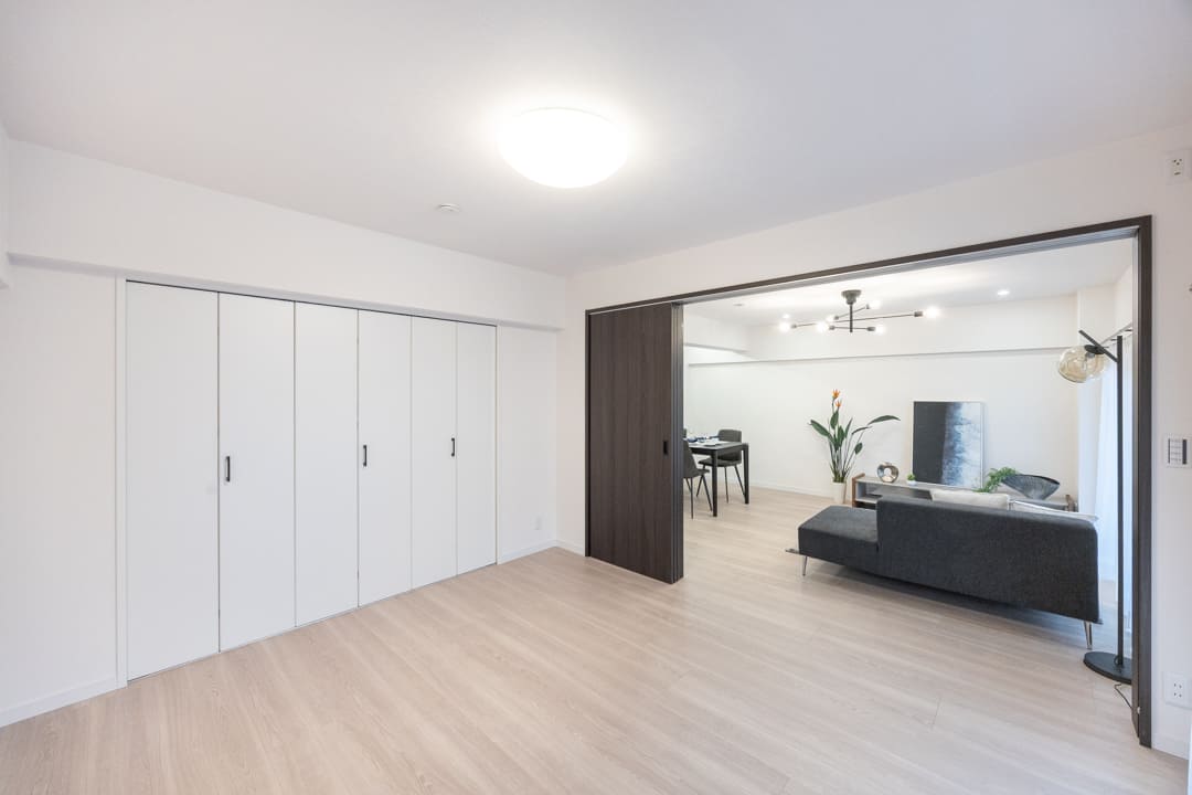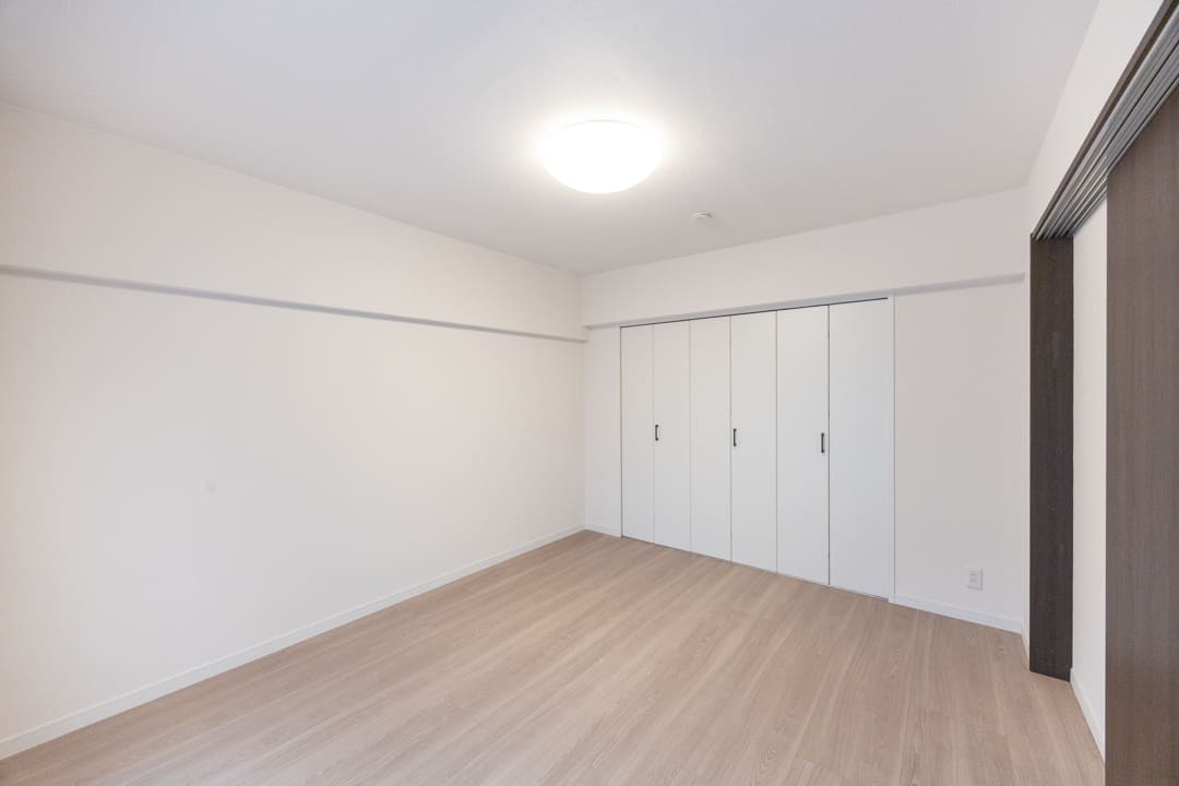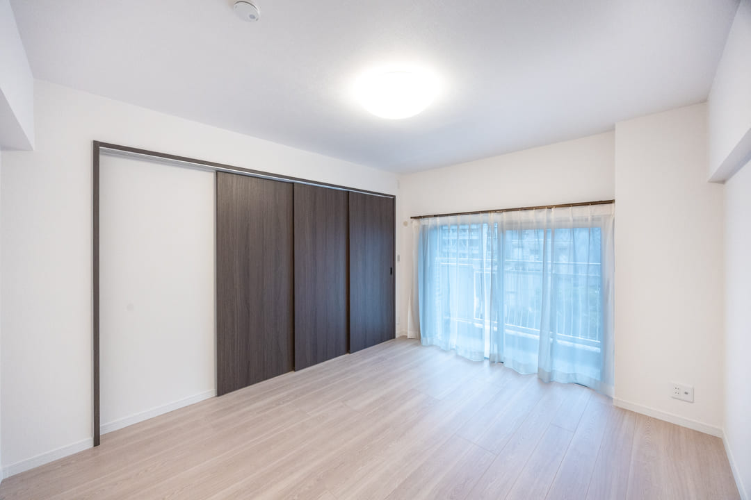 約7.2帖の洋室1。南東向きバルコニーに面し、明るい陽光が差し込む空間です。壁いっぱいにクローゼットが並び、収納充実◎。LDKとは引戸で仕切られているため、普段は扉を開放してゆったり過ごし、ゲストが来た時は扉を閉めてプライベート空間を隠すといった使い方もできます。