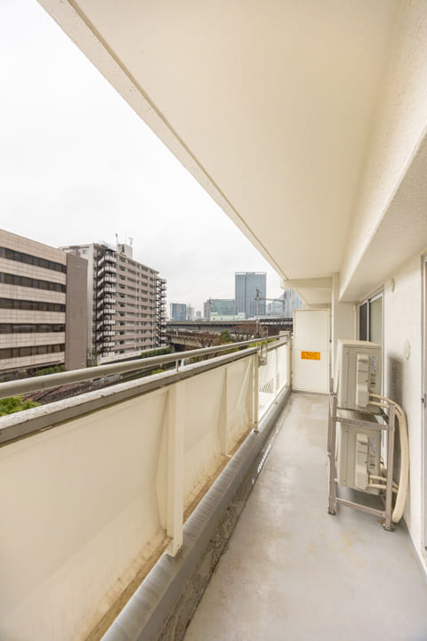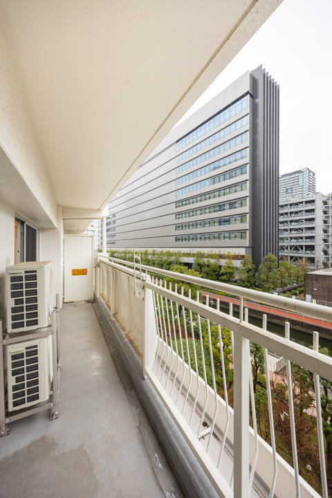 LDKと洋室1に面するバルコニー。南東向きのため、晴れの日にはあたたかい光が届きます。川沿いに位置し、木々の緑も見える開放的な眺め。朝の目覚めに軽いストレッチを楽しんだり、日中にほっと一息ついたりと、日常のひとときを豊かに演出します。