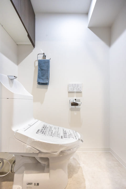 廊下に面していて独立性の高いレストルーム。TOTO製ウォシュレット一体型トイレに交換済みです。背面には吊戸棚を備え、トイレットペーパーや掃除用品をすっきり収納可能。扉付きで生活感を目隠しできるのも嬉しいポイントです。