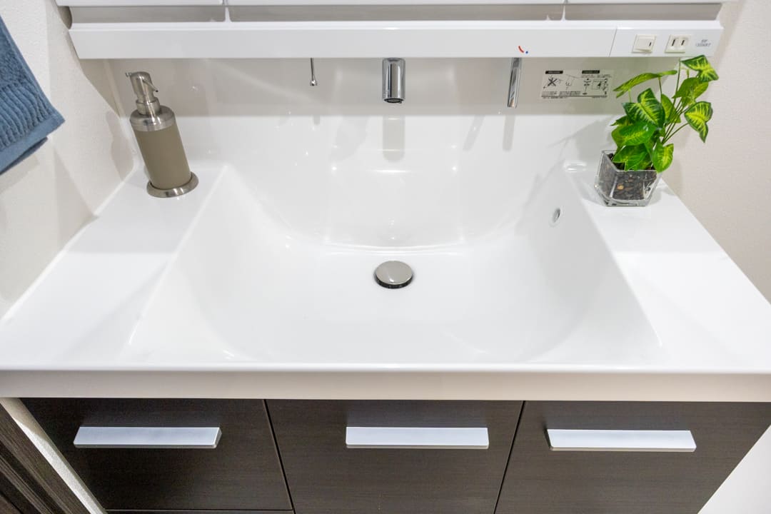 大きな三面鏡と大開口の洗面ボウルを備えた、使い勝手の良い洗面化粧台。三面鏡裏は収納棚になっていて、洗面まわりの小物をすっきり収納できます。洗面ボウルはカウンターと一体成型なので、汚れが溜まりづらくお手入れ簡単。上部から吐水する水栓を採用していて、水栓まわりに水が溜まりにくいのも嬉しいポイントです。