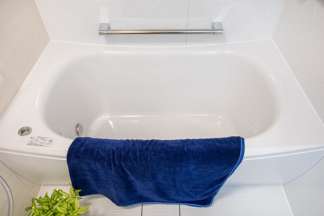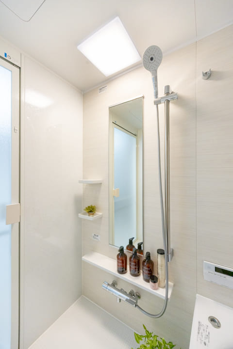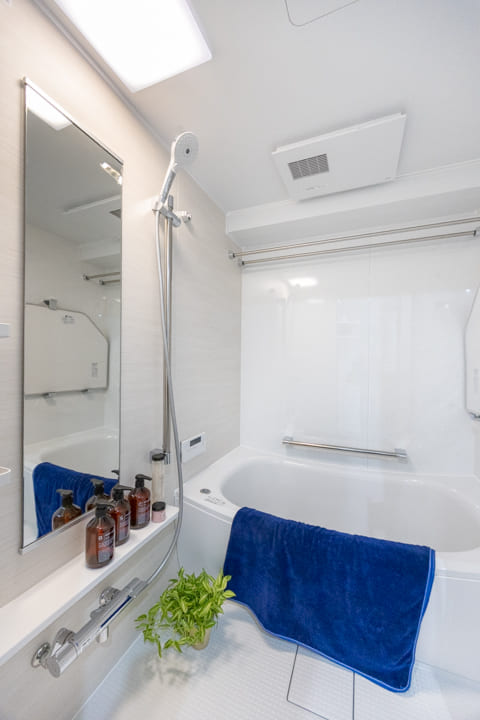 木目柄のアクセントパネルが温もりと清潔感を演出するバスルーム。換気・暖房・乾燥・涼風機能付きで1年中快適なバスタイムをお過ごしいただけます。雨天時の洗濯乾燥や湿気対策にも配慮された仕様。追い焚き機も搭載されているため、家族の入浴時間が異なる日や、ゆったりと半身浴を楽しみたい時にも重宝します。