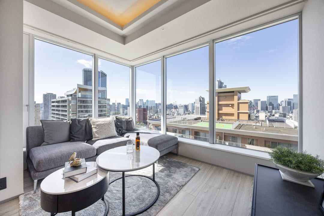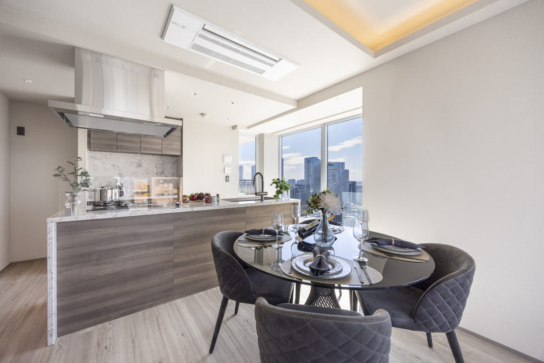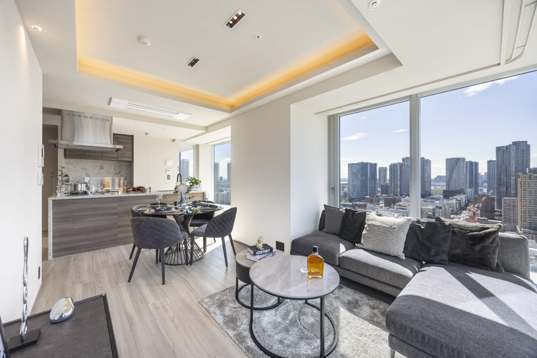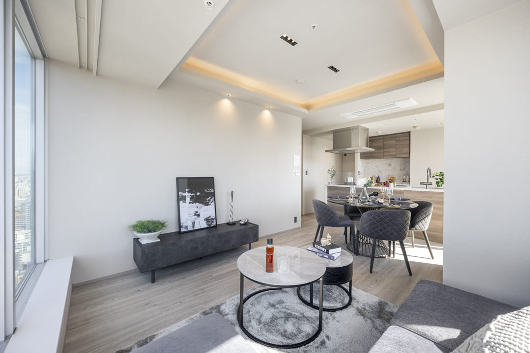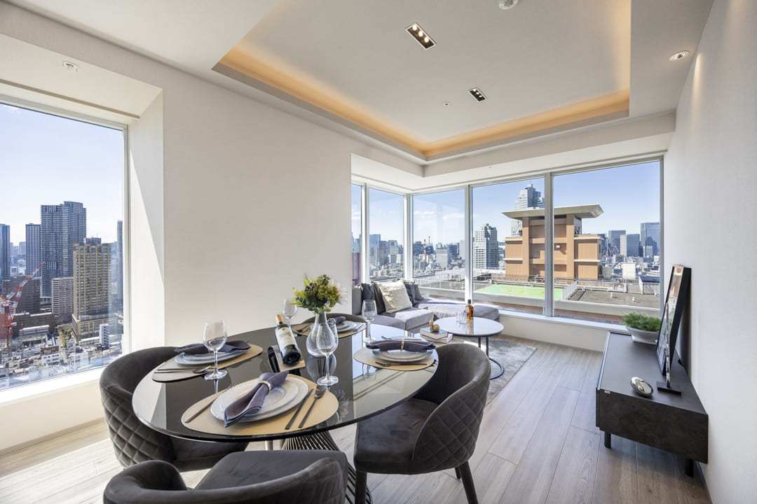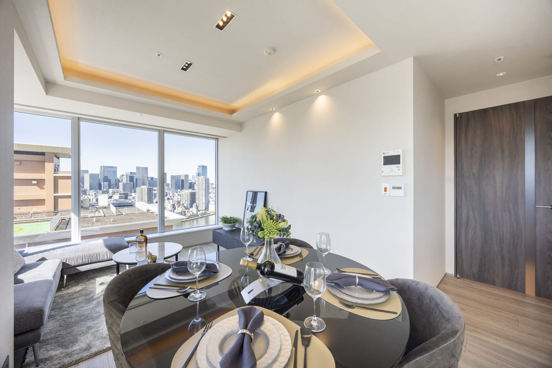 大開口の窓が連なる北西・南西の2面採光で、開放感あふれるリビングダイニング。キッチンと合わせて約16.0帖の広々とした空間です。31階部分につき、窓の先には青空が広がり、その奥には東京タワーも望めました(※天候によります)。間接照明が施された上質な内装も魅力。心地よい光に包まれながら、家族団らんのひとときをお過ごしいただけます。