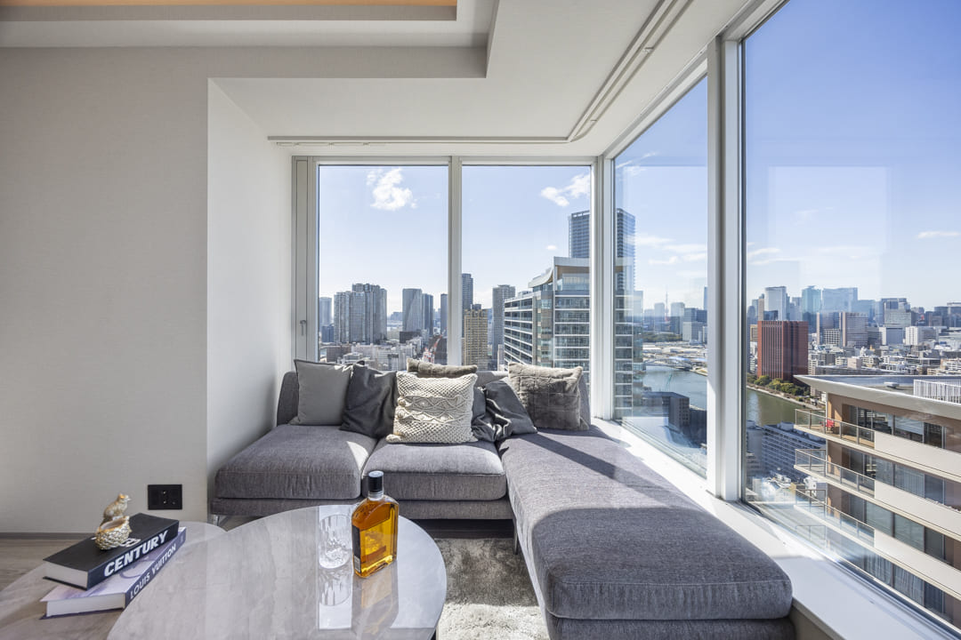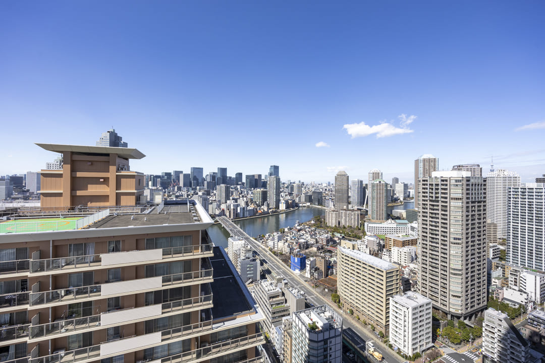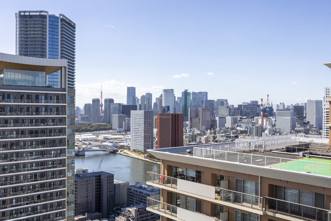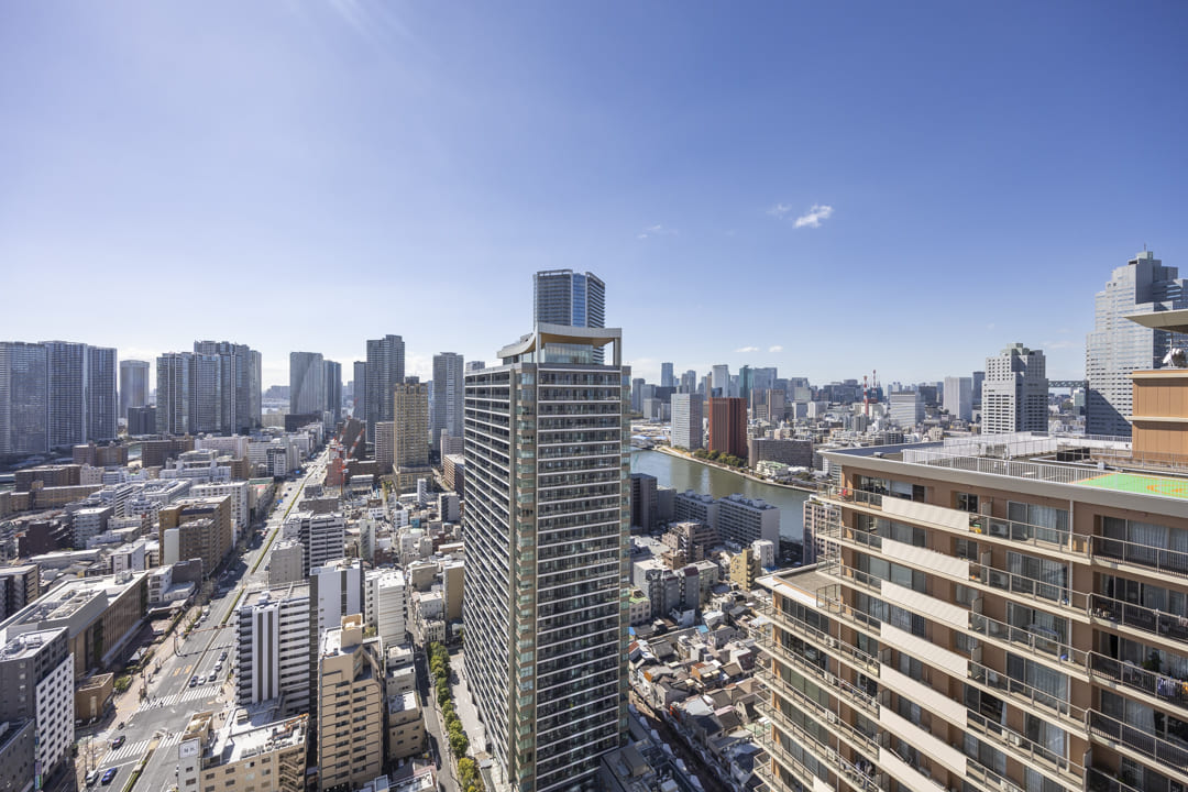 2015年に竣工した「キャピタルゲートプレイスザ・タワー」。地下2階付地上53階建、総戸数737戸の大規模タワーマンションです。オートロックと24時間有人管理体制を採用し、安心のセキュリティを備えています。館内にはライブラリーカフェやスカイラウンジなどの共用施設も設けられています。東京メトロ有楽町線・都営大江戸線「月島」駅8b出口直結で、2階部分から改札階までエレベーターでアクセス可能。雨の日も快適に電車をご利用いただけます。ご紹介するお部屋は31階部分、専有面積75㎡の3LDK。南西・北西向きの角住戸で、2面採光のLDKには大開口の窓が並び、空の広がりを感じる眺望が広がります。2面バルコニーやアイランドキッチンを備え、開放感と心地よさを兼ね備えた住まいです。
