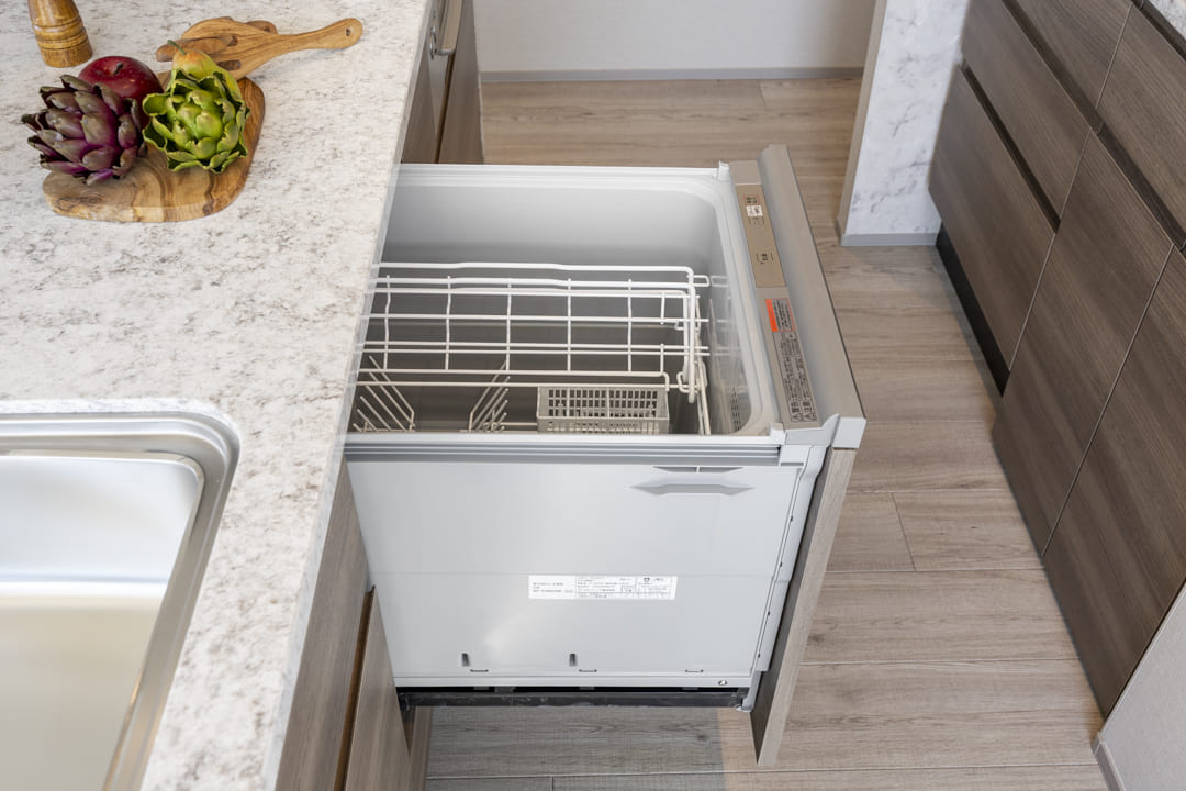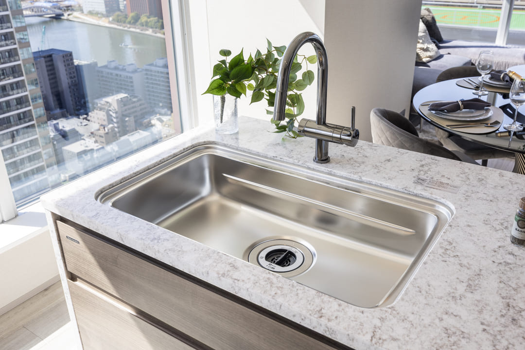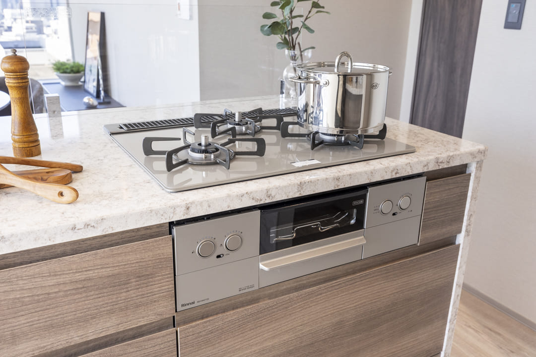 同時調理が叶うグリル付3口ガスコンロを内蔵。さらに、ディスポーザーと食洗機も完備されています。料理後すぐに生ゴミを処理できるので、悪臭の原因を防ぎ、掃除の手間を軽減。食器洗いも捗り、後片付けの時短が叶います。