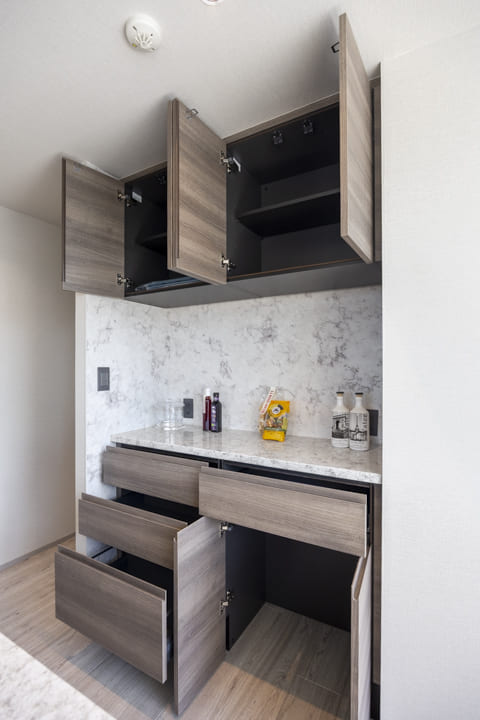 背面にはキッチンとデザインを揃えたカップボードを設置。統一感のある美しい空間を保ちながら、食料品や食器類をすっきりと収納できます。カウンターにはコンセントも設けられており、家電の使用にも配慮された設計です。
