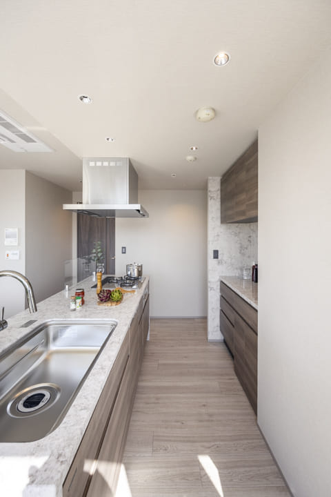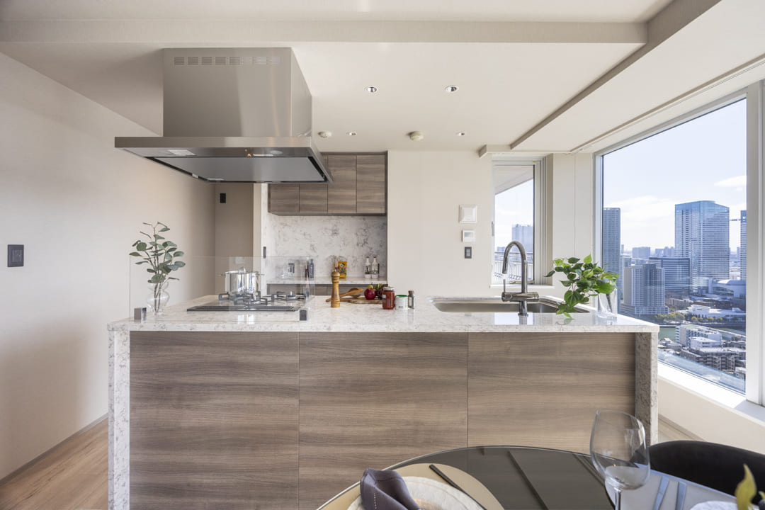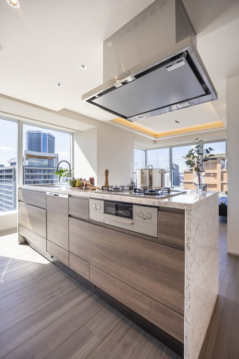 存在感のあるアイランドキッチン。左右から出入りできるため、複数人でも作業しやすいのが特徴です。パートナーやゲストと一緒に調理を楽しめそうですね。リビングにいる人とも顔を合わせながら作業ができ、自然と会話が生まれる空間です。シンク側には窓があり、開放的な気分で調理が可能。石調カウンターと木目の扉が調和し、洗練された印象を演出します。