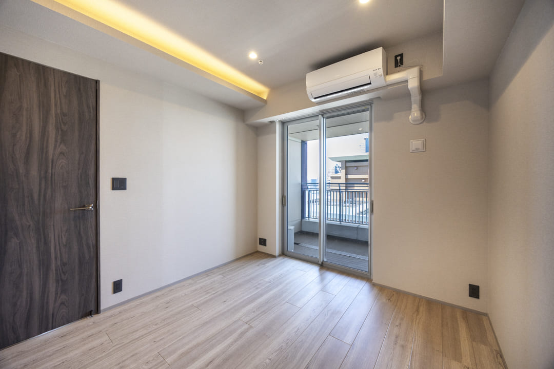 約6.5帖の主寝室。LDKから最も離れた位置にあり、プライベート性の高い空間です。南西向きの窓からやわらかな自然光が差し込み、奥行きを感じる心地よい室内。間接照明の穏やかな光が空間をやさしく包み込み、1日の終わりをゆったりと過ごせる、落ち着きある寝室に仕上がっています。